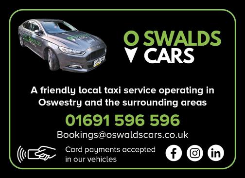 49 A FRIENDLY LOCAL TAXI SERVICE 01691 596 596 • Bookings@oswaldscars.co.uk We accept card payments in all our vehicles TIME TO GET YOUR TIME TO GET YOUR MARKETING SORTED? MARKETING SORTED? MARKETING STRATGEY & PLANS MARKETING STRATGEY & PLANS SOCIAL MEDIA MANAGEMENT SOCIAL MEDIA MANAGEMENT PR PR BLOGS & CONTENT CREATION BLOGS & CONTENT CREATION NEWSLETTERS NEWSLETTERS E-MARKETING E-MARKETING FACEBOOK & INSTRAGRAM FACEBOOK & INSTRAGRAM ADVERTISING ADVERTISING Get in touch today! 01691 655518 / 07917 787804 hello@martinandjonesmarketing.co.uk www.martinandjonesmarketing.co.uk Hit the ground running with a marketing power hour! Chartered Marketeers MARKETING We’ll fix it and make it look as good as new! All Models! • Accident Repair • Insurance Work • Welding • Bumps & Scuffs • Resprays Courtesy Vehicle Available J.W Butler tanat Motor Bodies tel: 01691 780113 Llanrhaeadr-ym-Mochnant Oswestry SY10 0AA Are you struggling with: Back & Neck Pain? Joint & Muscle Pain? Headaches? Womens Health Issues? Grumpy Babies & Children? Sleep, Stress or Nutrition? I can help! Claire Arnold Registered Osteopath & Lifestyle Medicine Practitioner Hands on Cranial Osteopathic Care & Lifestyle Medicine Advice for your Families Call 07792 367507 Herbarium & Massage Centre 15 Albion Hill, Oswestry SY11 1QA OSTEOPATH SPECIALIST MOTOR SERVICES