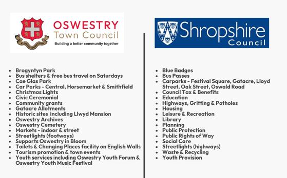Below is a summary of the services provided by Oswestry Town Council and Shropshire Council. If you have questions for us, please email enquiries@oswestry-tc.gov.uk or pop into the Guildhall. For Shropshire Council enquiries visit www.shropshire.gov.uk.