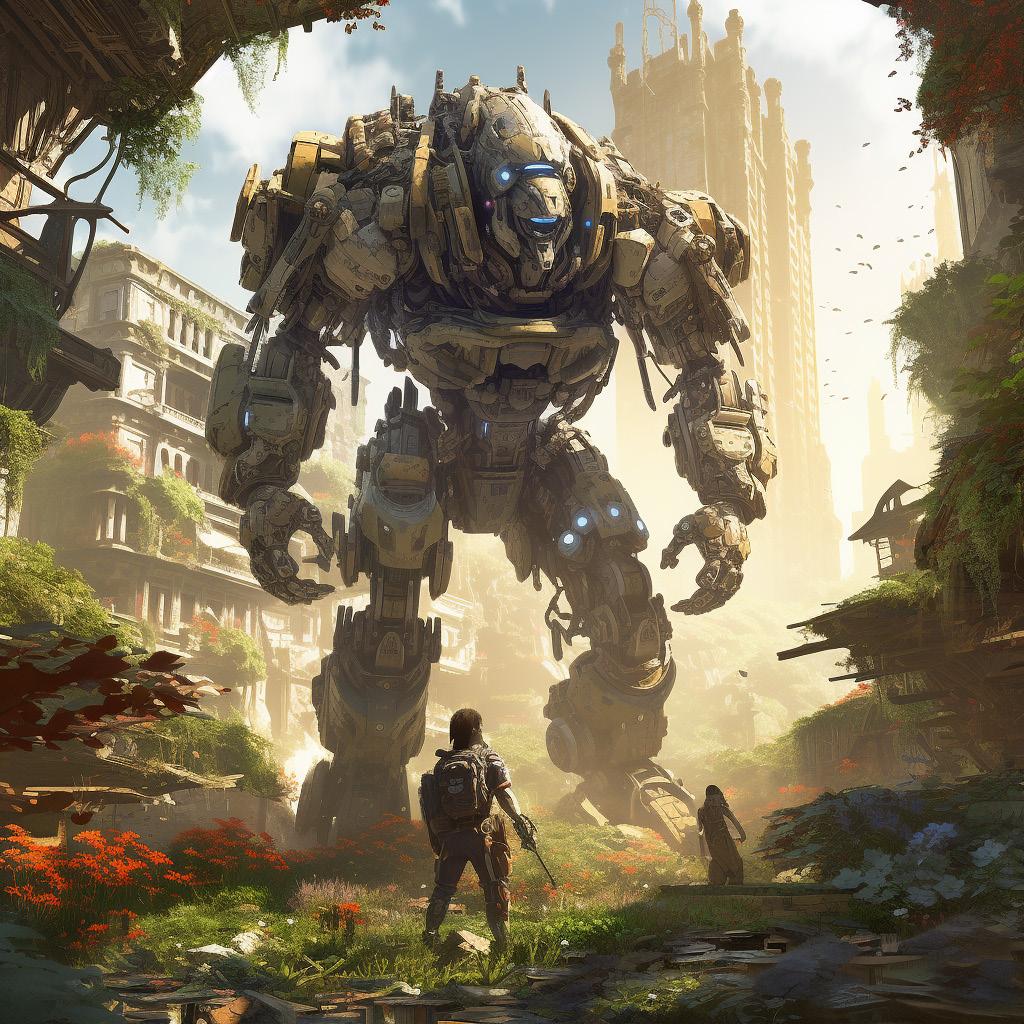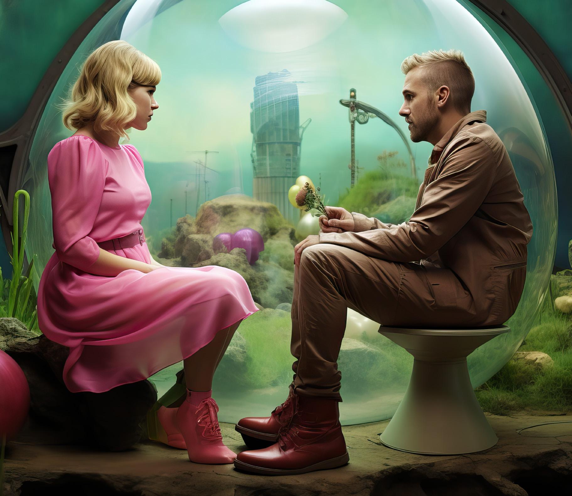 in the shade of an elm tree. He is wearing brown pants, a sage green tunic, and boots. She is wearing a simple pink dress and sandals, and has pink ribbons tied in her blonde hair. Off in the distance is a bio-dome with a city inside it.