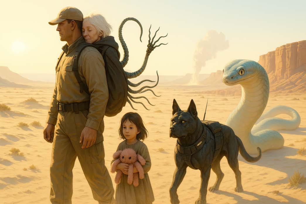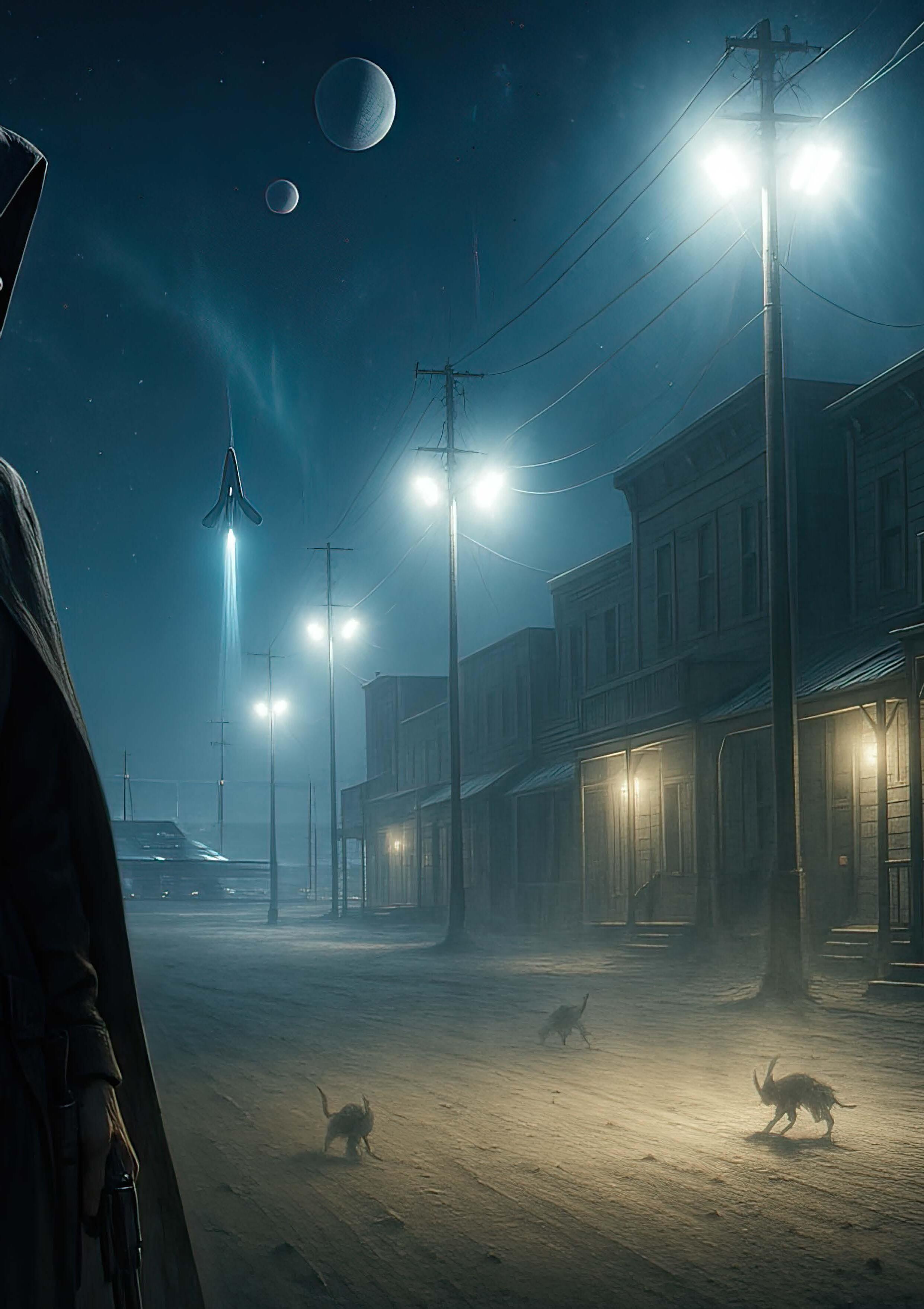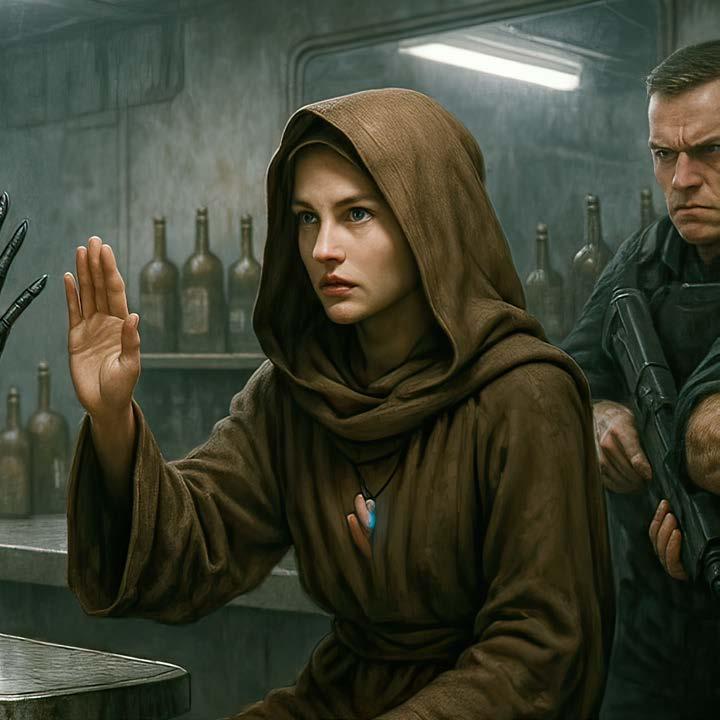 where a fortune teller threads two couples across branching timelines toward an unforeseen crossing. In “Tell Me a Story,” Mike Player seats Squirrel beside her great-great-grandfathers, where an old tale unwraps a secret with her name on it. Robert Walton’s “Picket Duty” stands Joe and Hannah on a cold line, guarding inter-dimensionals while the Necro-Fascist Alliance tests the perimeter. And in “The Gun-Slinging Nun,” E. S. Canela rides into Abilene III, chasing a thaumaturgic boy as WyrdBeasts darken the saloon doors. These fictions press the membrane of the known, humming at the brink of rupture and bloom.