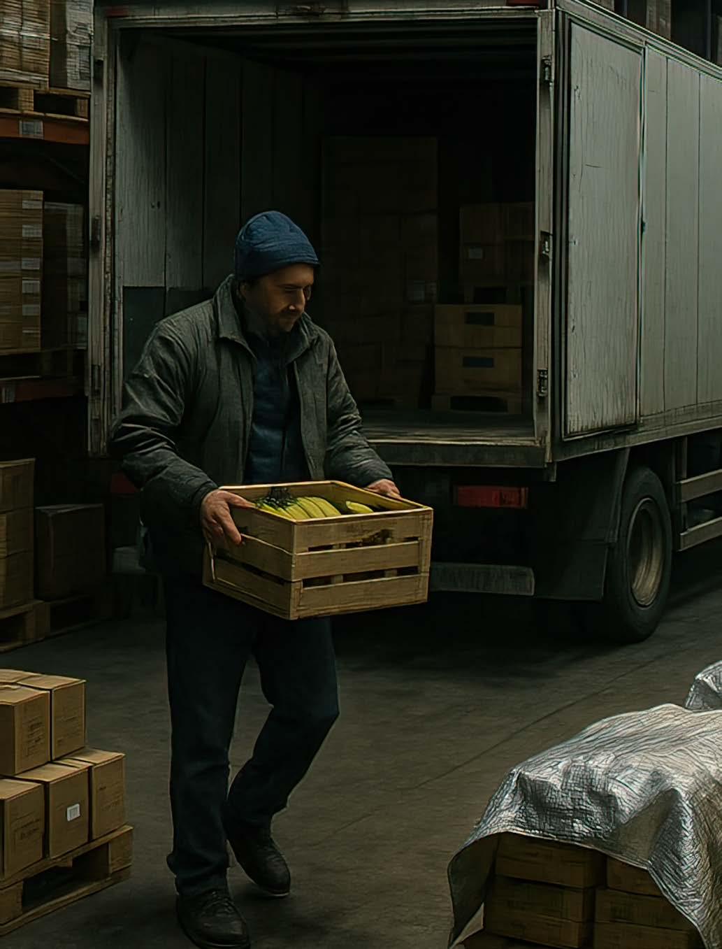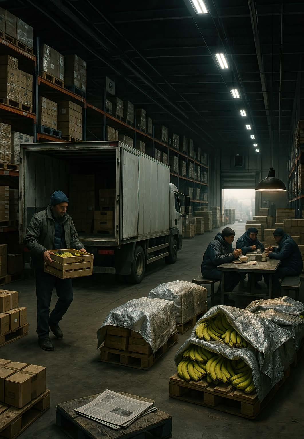 The truck was on time—a new driver who didn't speak Swedish. The major supermarket chains, Ica, Coop, and Willys, sorted the goods. They put protective blankets over the bananas so they wouldn't freeze, and then they settled down to lunch with the other workers.