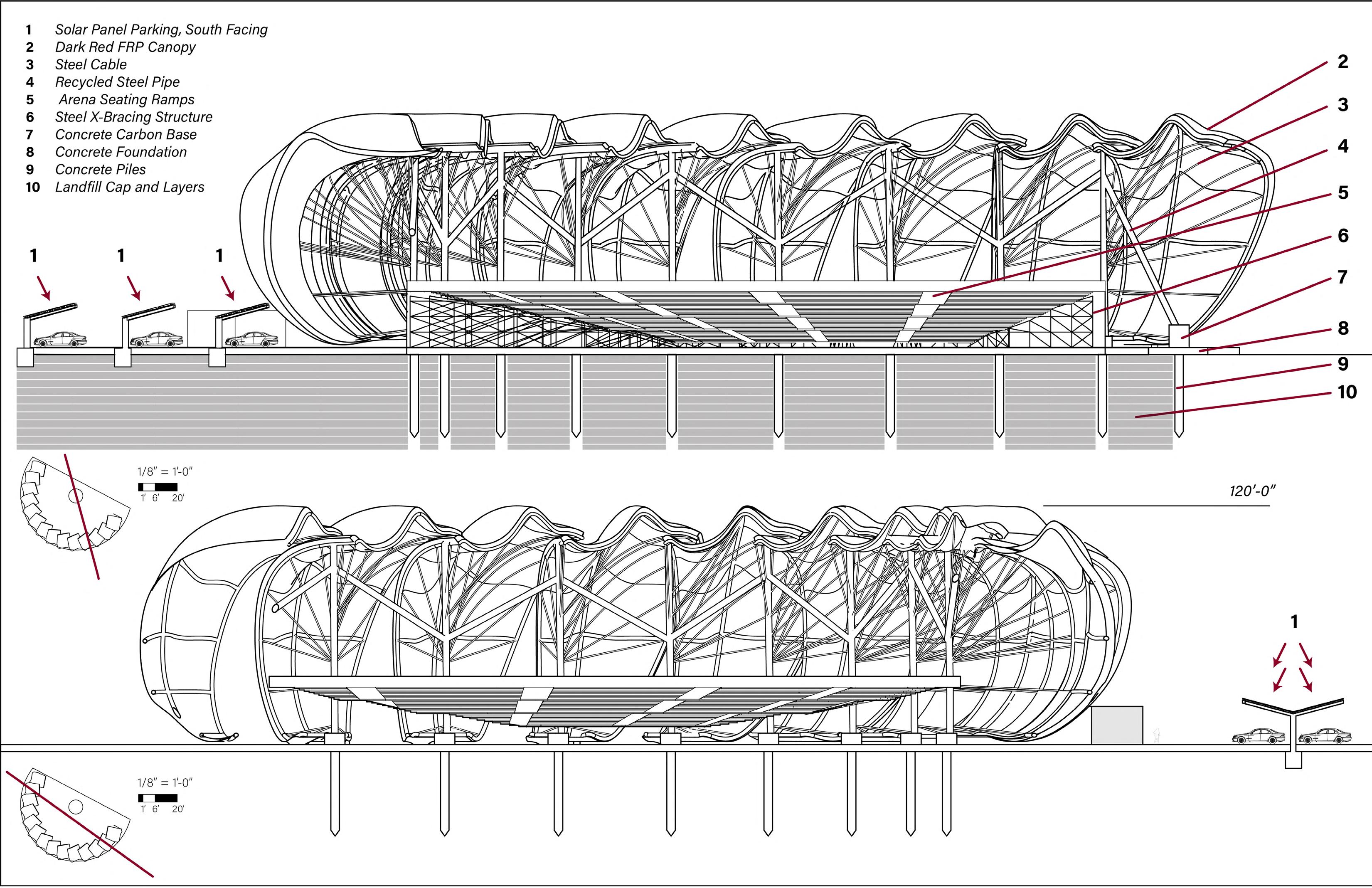PIPES IN WAVES TO ACT AS SHADING MAIN FRAME TO SURROUND THE WAVES MINIMAL SUPPORTS POSTS AS STRUCTURE