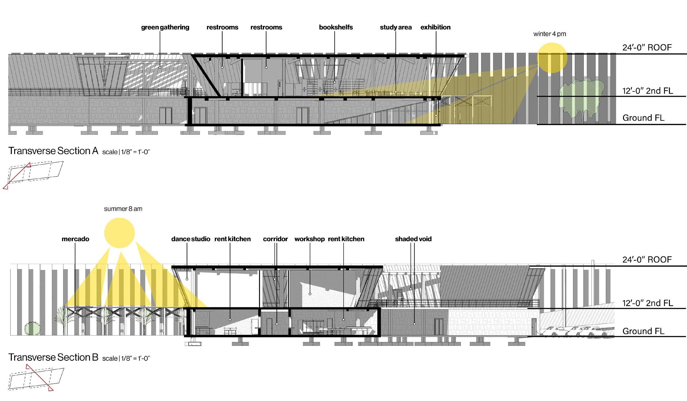 The design actively expresses the dynamic relationship between the local market shop rentees and community through in person visits to the marketplace. The revitalization design proposal is a response to community needs, cultural integration, and well being.