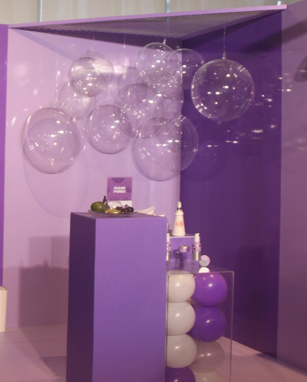 Elements of circles on the booth design are translated as a symbol of pores, foamy products, or ingredients.