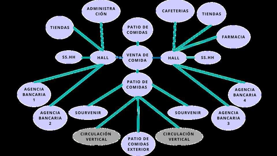 ESQUEMA FUNCIONAL CIRCULACIÓN VERTICAL AGENCIA BANCAR A 2 C RCULACIÓN VERT CAL PATIO DE COMIDAS EXTERIOR VENTA DE COM DA HALL 158 66 M2 TIENDAS 105 10 M2 SS HH 56 79 M2 CIRCULAC ÓN 31 17 M2 AGENCIA BANCAR A 1 157 09 M2 SOURVENIR 31 17 M2 ADM NISTRACIÓN 179 40 M2 PAT O DE COMIDAS 726 89 M2 SS HH 56 79 M2 AGENC A BANCARIA 2 157 09 M2 AGENCIA BANCAR A 4 157 09 M2 AGENCIA BANCARIA 3 157 09 M2 VENTA DE COM DA 319 81 M2 T ENDAS DE DULCES 54 22 M2 CAFETERIAS 179 40 M2 PAT O DE COMIDAS EXTERIOR 196 41 M2 TIENDAS 43 85 M2 FARMAC A 61 25 M2 PLAZA 38 5 M2 PATIO DE COMIDAS SOURVENIR SOURVENIR AGENCIA BANCARIA 1 AGENCIA BANCAR A 3 AGENCIA BANCARIA 4 PATIO DE COMIDAS HALL HALL SS HH SS HH T ENDAS ADMINISTRACIÓN FARMAC A TIENDAS CAFETERIAS