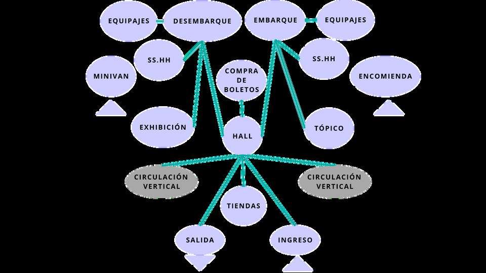 ESQUEMA FUNCIONAL HALL EQUIAJES 66 93 M2 BATERÍA DE BAÑOS 42 62 M2 EMBARQUE 762 20 M2 COMPRA DE BOLETOS 146 05 M2 2 TIENDAS 13 86 M2 BATER A DE BAÑOS 42 62 M2 EQUIAJES 66 93 M2 MIN VAN 371 13 M2 ENCOMIENDA 365 34 M2 CIRCULAC ÓN 31 17 M2 HALL 148 58 M2 3 TÉLEFONOS 6 56 M2 3 CAJEROS 6 43 M2 CIRCULAC ÓN 31 17 M2 TÓPICO 72 61 M2 EXHIBIC ÓN 71 05 M2 DESEMBARQUE 762 20 M2 C RCULACIÓN VERT CAL EMBARQUE EQUIPAJES SS HH TÓPICO ENCOMIENDA DESEMBARQUE EQUIPAJES SS HH EXHIBIC ÓN MINIVAN CIRCULAC ÓN VERTICAL T ENDAS COMPRA DE BOLETOS SALIDA INGRESO