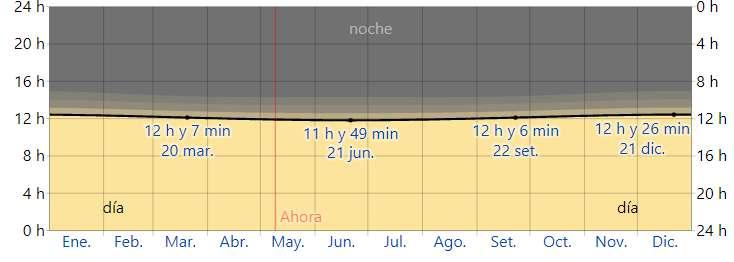 El día más corto es el 21 de junio, con 11 horas y 49 minutos de luz