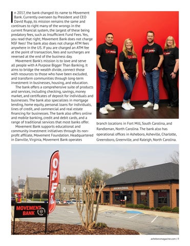 n 2017, the bank changed its name to Movement Bank. Currently overseen by President and CEO David Rupp, its mission remains the same and continues to right many of the wrongs in the current financial system, the largest of these being predatory fees, such as Insufficient Fund Fees. Yes, you read that right; Movement Bank does not charge NSF fees! The bank also does not charge ATM fees anywhere in the US. If you are charged an ATM fee at the point of transaction, fees and surcharges are reversed at the end of the business day. Movement Bank's mission is to love and serve all people with A Purpose Bigger Than Banking. It aims to bridge the wealth divide, connect those with resources to those who have been excluded, and transform communities through long-term investment in businesses, housing, and education. The bank offers a comprehensive suite of products and services, including checking, savings, money market, and certificates of deposit for individuals and businesses. The bank also specializes in mortgage lending, home equity, personal loans for individuals, lines of credit, and commercial and real estate financing for businesses. The bank also offers online and mobile banking, credit and debit cards, and a range of traditional services that most banks offer. Movement Bank supports educational and community investment initiatives through its nonprofit affiliate, Movement Foundation. Headquartered in Danville, Virginia, Movement Bank operates
