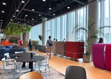 Gensler used a ceramic material that is inspired by natural oak wood for the towering bookshelves around the space, creating a warm feeling for reading and studying. The bookshelves also hide more private shops or cafes within that allow the space to have a variety of differently-sized spaces.