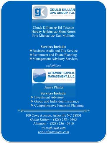 Advantage Direct 26 ALFIE BC Asheville Area Arts Council 35 Asheville Dental 3 Asheville Eye Associates 74 Asheville Symphony Chorus 58 Asheville Symphony Guild 62 Asheville Symphony Symphonettes 60 Asheville Symphony Youth Orchestra 64 Awaken Skin & Body 73 Biltmore Estate 12 The Blackbird 44 Blackbird Frame & Art 68 blue 70 Blue Ridge Public Radio 50 Blue Spiral 1 8 Celine & Co. 10 Citizen Times 6 Clover CBD Dispensary 51 Gillespie Dental Associates 19 Givens Estate 54 Gould Killian CPA Group, P.A. 10 Groce Funeral Home 74 Hatchworks Coworking 18 Helle Creative 33 Hi-Wire Brewing 41 Highland Brewing 15 HomeTrust 2 iHeart Media 4 Kathryn Theodore Travel Advisors 54 Kimpton Hotel Arras 34 McGuire Wood & Bissette Law Firm 16 MemoryCare 69 Mercy Urgent Care 68 Mission Health 75 Modesto 72 Morgan Stanley 70 Northwestern Mutual 73