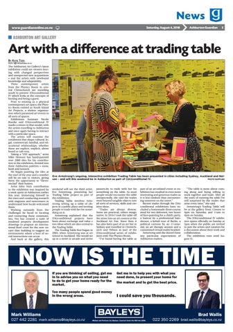 part of an art-related event or exhibition has resulted in even more interesting and generous trades as it is less random than encountering someone on the street.” Recent trades through the (Un) conditional exhibitions have included a homemade three-course meal for two delivered, two hours of face-painting for a child’s party, a haircut by a professional hairdresser, a kebab tour of Berlin, a political cartoon by an 11-yearold, an art therapy session and a customised virtual reality headset. Armstrong said she doesn’t have any particular expectations of Ashburton traders.