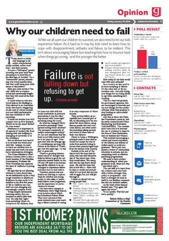 it as a key component of future success. They portray failure as acceptable and a normal part of life, by discussing how the students felt about failure, using famous people who had overcome failure, and other activities including asking parents and tutors to share tales of their own failures. Closer to home, a Wellington principal made it clear that he would not accept the tide of notes from parents trying to excuse their primary-aged boys from the annual cross country. Instead, at the end of the day, he told the boys that for some, this was their favourite day of the school year when they would shine. For many, this was the day they’d dread most. He told the boys that this is how life is – there will be days or weeks and periods when it’s not your day and you will struggle, but you will get through it. I think we should tell our young people that: ■ Bill Gates’ first business failed? ■ Stephen King’s first novel was rejected 30 times? ■ Thomas Edison failed 1000 times before creating the lightbulb? ■ Vincent Van Gogh only sold one painting in his lifetime?