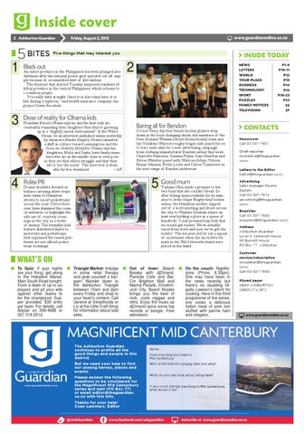 CONTACTS Newsroom Call 03 307-7957 Chief reporter michelle.n@theguardian. co.nz Letters to the Editor editor@theguardian.co.nz Advertising Sales manager Desme Daniels Call 03-307-7974 advertising@theguardian. co.nz Enquiries Call 03-307-7900 enquiries@theguardian.co.nz Address Ashburton Guardian Level 3, Somerset House 161 Burnett House PO Box 77, Ashburton Customer service/subscription circulation@theguardian. co.nz Call 03-307-7900 Missed paper 0800 ASHBURTON (0800 274 287)