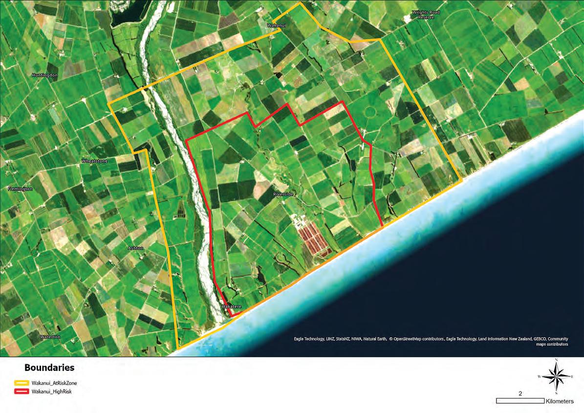 ABOVE – The Wakanui area will be put under a Controlled Area Notice (CAN) from October 13, restricting the movement of cattle in an effort to stop Mycoplasma bovis circulating in the area. It includes a high-risk area (red) and at-risk area (orange).