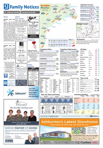 GOODWIN, Shirley Elizabeth MID CANTERBURY FUNERAL SERVICES On June 14, 2014. Loved youngest daughter of the late provide choice! Bill and Blanche Johnston Galbraith’s Galbraith’s FORDE, Stephen John – We have a team of highly respected, professional funeral directors and (Willowby), and loved sister celebrants. We offer you complete funeral care including pre-arrangement, 22/08/1986 - 16/06/1994. In provide choice! and your choice of venue, funeral celebrants and catering. of Clive and Valda Johnston loving memory of our dear We believe that every life is unique and every person’s funeral needs to (Tinwald) and Annette and son and brother who left us reflect their individualityCall - ask us howus we can be of assistance to you and on Brian Sharp (Matakana). your A family. twenty years ago today. Call us on 308 3980 special aunt and great-aunt 308 3980 Remembering you is easy. to Nigel and Robert John-or call in and visit our new premises at We do it every day. or246 callHavelock in andStreet visit ston and Carolyn Coster and It’s the heartache Andrew Leadley and their our new premises at of losing you, families. Eion McKinnon Rob Cope-Williams That never goes away. 246 Havelock Love Mum, Dad, Michael and Street Kelly. Please note all late death notices or notices sent out-Official Opening 18 Feb - 9am til 4pm FUNERAL side ordinary office hours must be emailed to: FURNISHERS