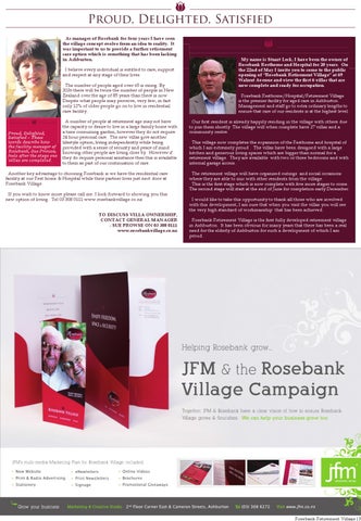 Another key advantage to choosing Rosebank is we have the residential care facility at our Rest home & Hospital while their partner lives just next door at Rosebank Village. If you wish to know more please call me. I look forward to showing you this new option of living. Tel 03 308 0111 www.rosebankvillage.co.nz TO DISCUSS VILLA OWNERSHIP, CONTACT GENERAL MANAGER - SUE PROWSE ON 03 308 0111 www.rosebankvillage.co.nz