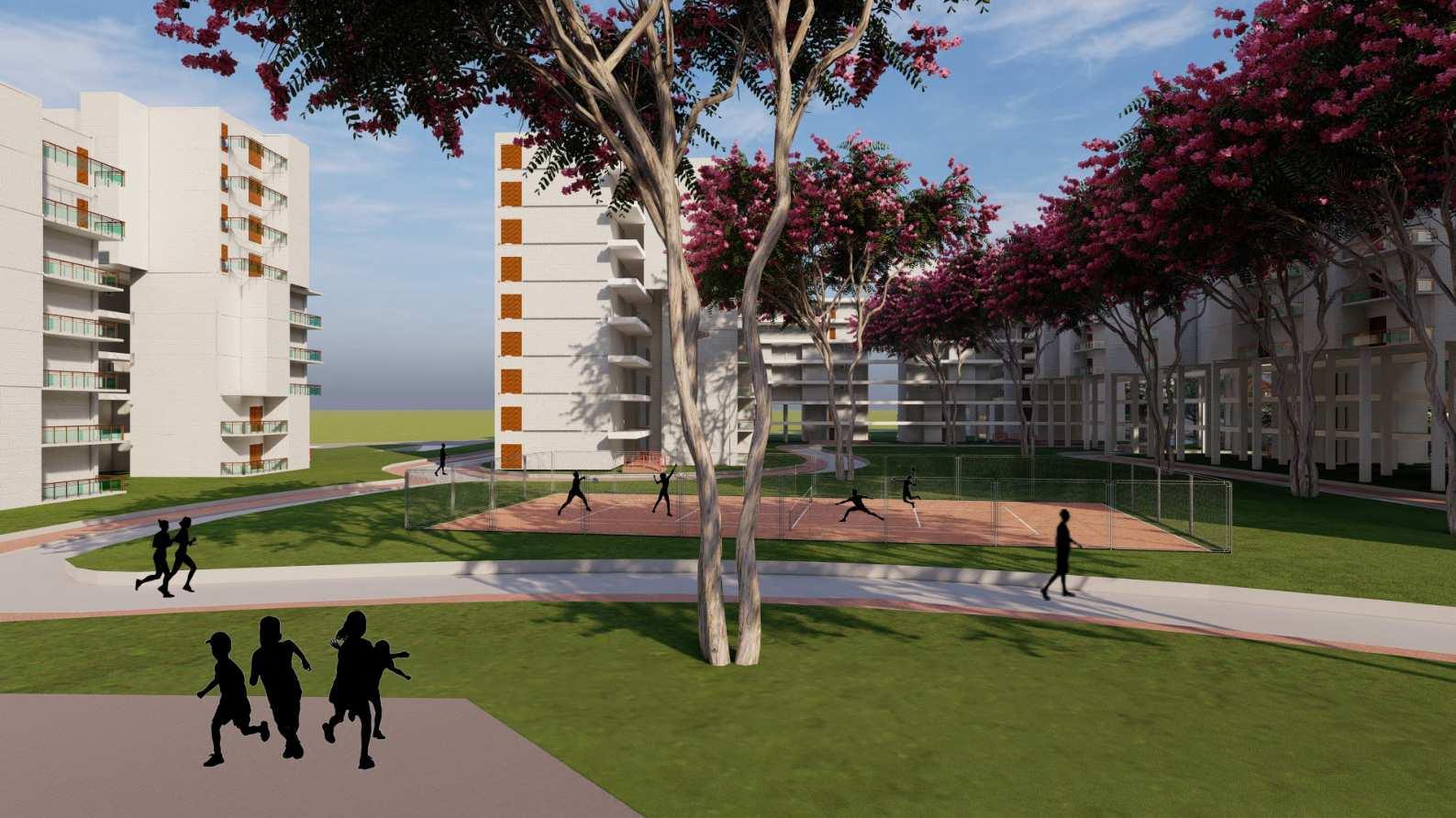The aim of modifying the massing was to offer a view of the heritage structure, the baoli, with streets running at a 45° angle from the peripheral road to the green belt. This improved visual connectivity to both the Baoli and the green belt, attracting residents to utilize the open spaces. This digital massing model illustrates the adjustments made to ensure views of the Baoli from all units.
