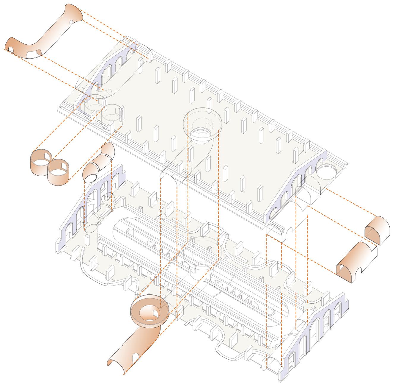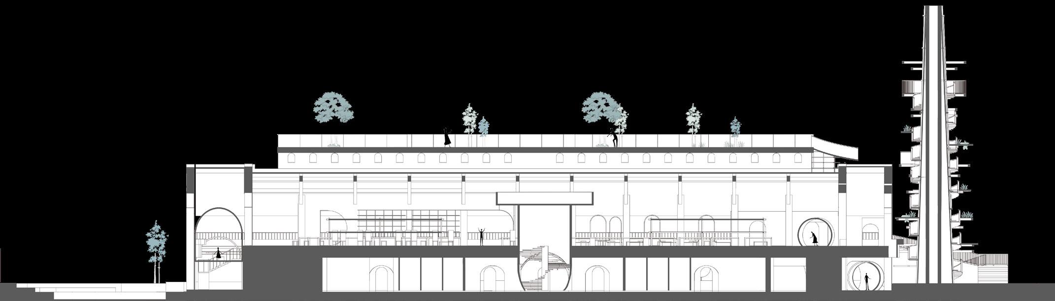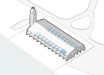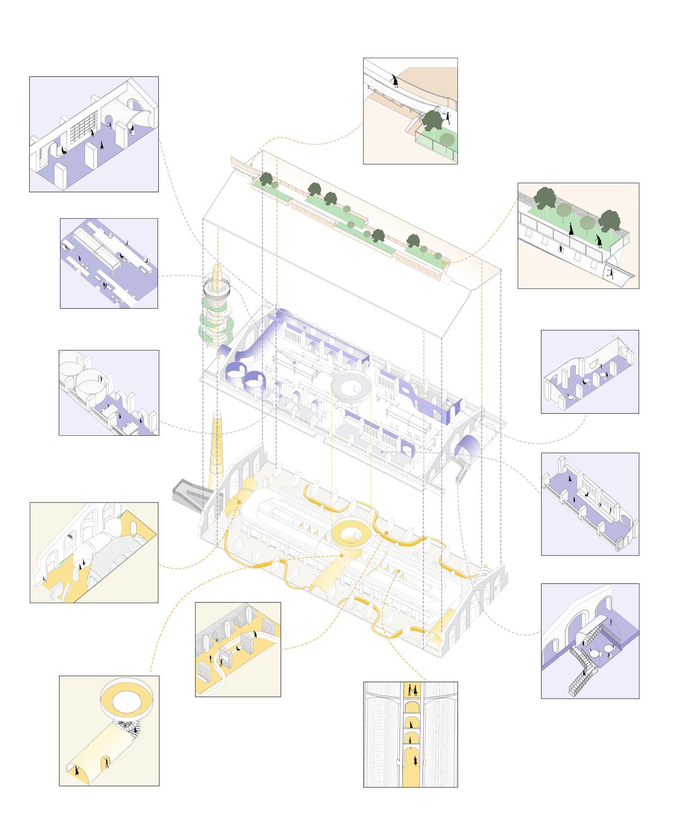 I investigate transformational possibilities from both historical and contemporary viewpoints. The ground level has been constructed as a museum devoted to the history of brick kilns and kiln techniques, with new arching features preserving the existing brick kiln. The combination of the new brick arches and the old brick kiln transforms the factory from a manufacturing identity into a site for cultural transmission, transporting us back in memory.