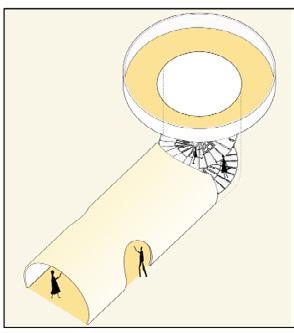 Architectural features of 'arch' and 'threshold'' in the kiln Different sizes of organic material pipes are placed in both ground & first foor. Inside the pipeline are holographic projections and interactive devices, which are mainly used for the interaction between people and space.