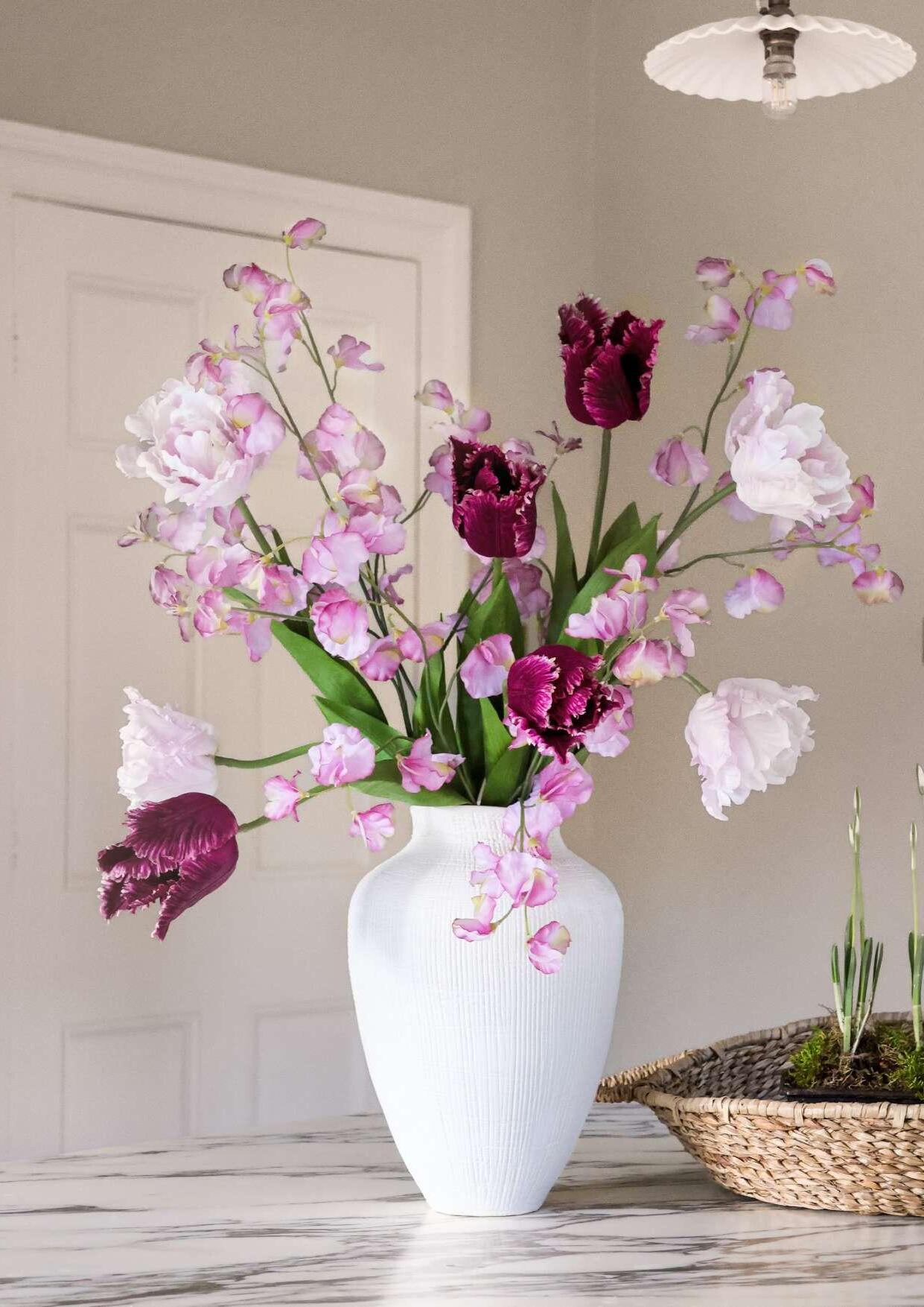 Much of the palette began in my garden last year. The velvety depth of ‘Queen of Night’ tulips paired with zingy greens sparked our lilac and deep-purple tulips and sweet peas, elevated with our green berry branches and plum blossom. The combination felt unexpectedly refined and entirely true to nature. And then there were the ‘La Belle Epoque’ tulips. Those peach to caramel tones with ruffled petals became an immediate obsession.
