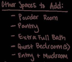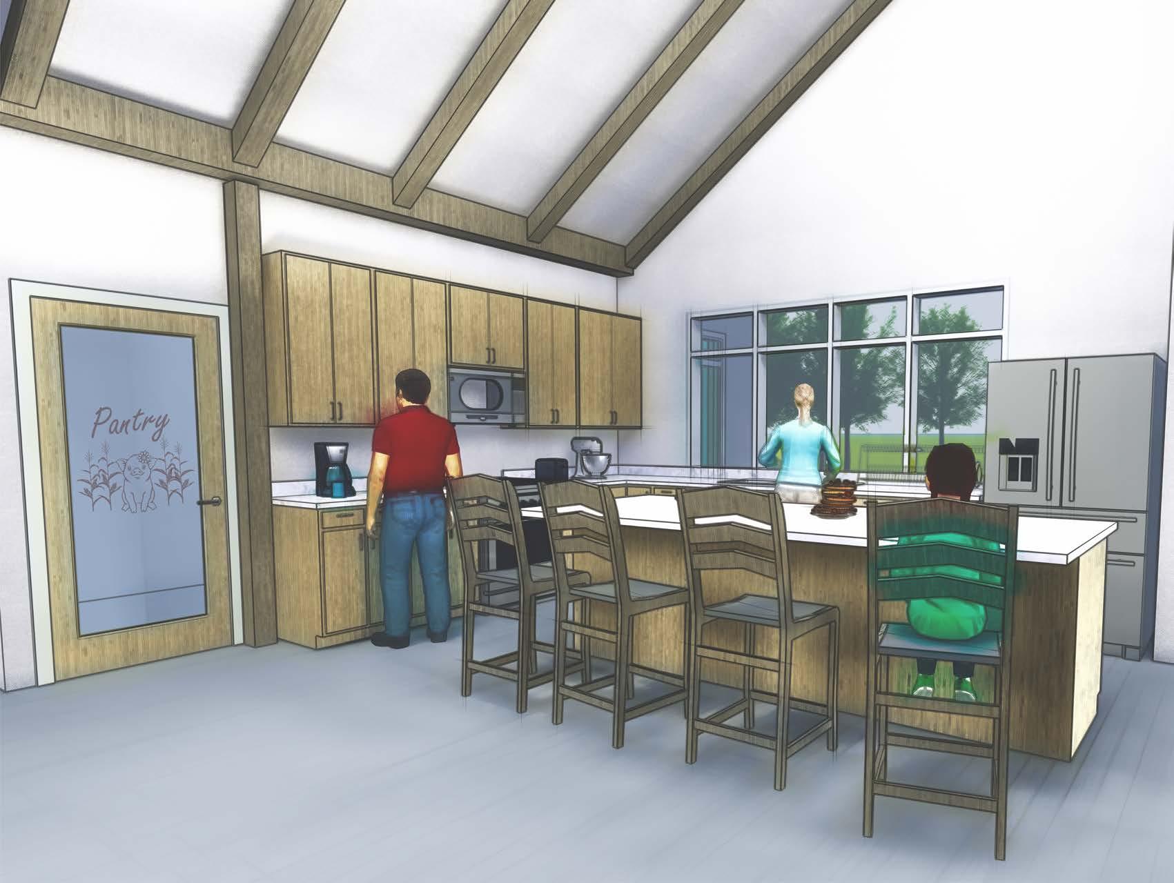KITCHEN: Many purposes. Primary use for cooking and baking, which happen at all times of year, but especially important that there is an ample amount of space. Important note that homeowners wish to have north facing window. Pantry to store both food, small appliances, and recipe books.