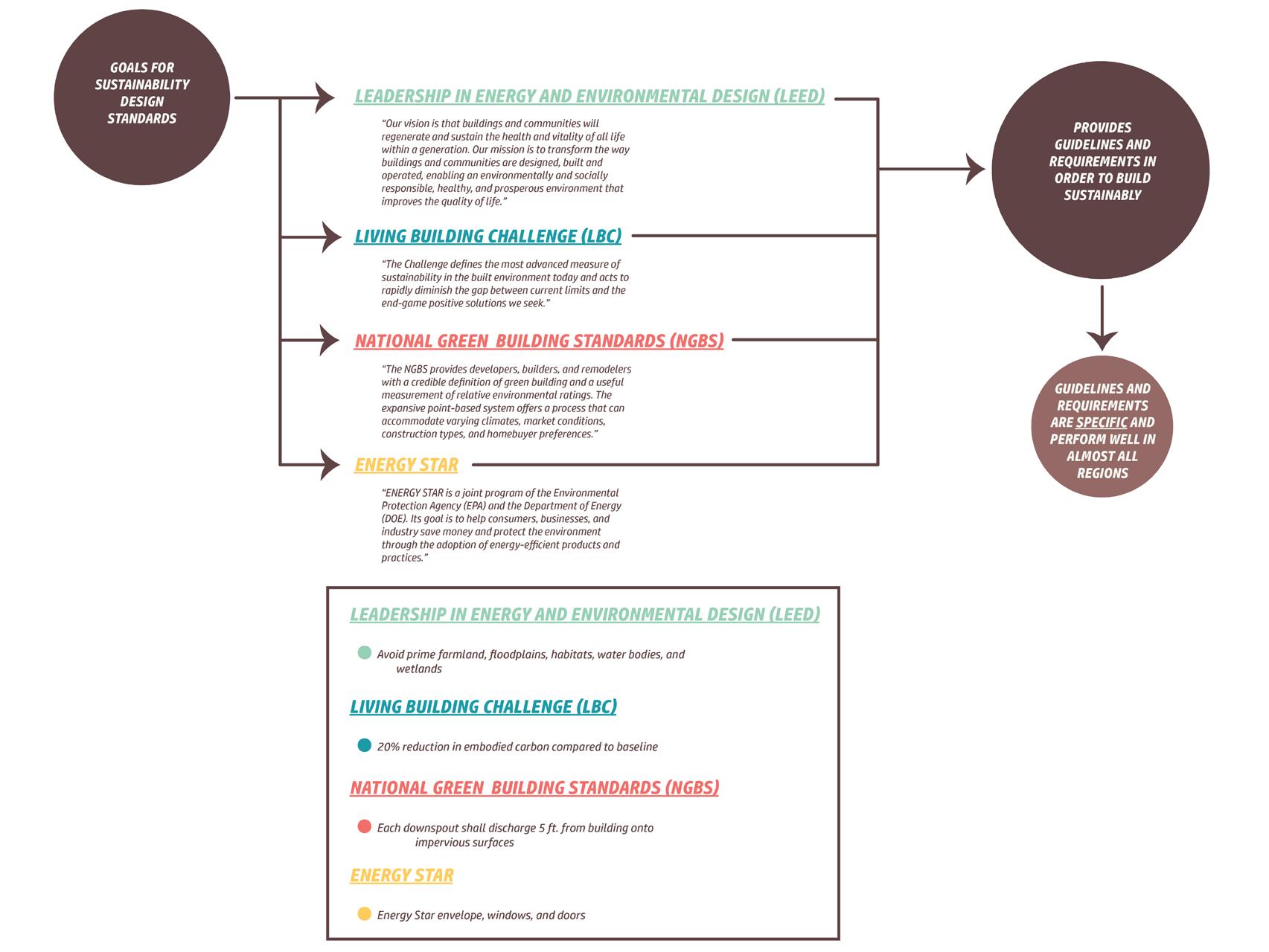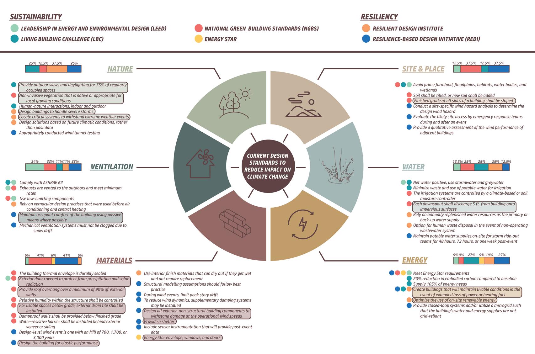 There are a great amount of design standards that exist today. The majority of standards relate to sustainability, but there are a few standards relating to resiliency. I was able to break these standards up into 6 categories, including site & place, water, energy, materials, ventilation, and nature. Through research, I have found that sustainability goals are typically very specific and exact, while resilience goals are loose and typically require professional skills.