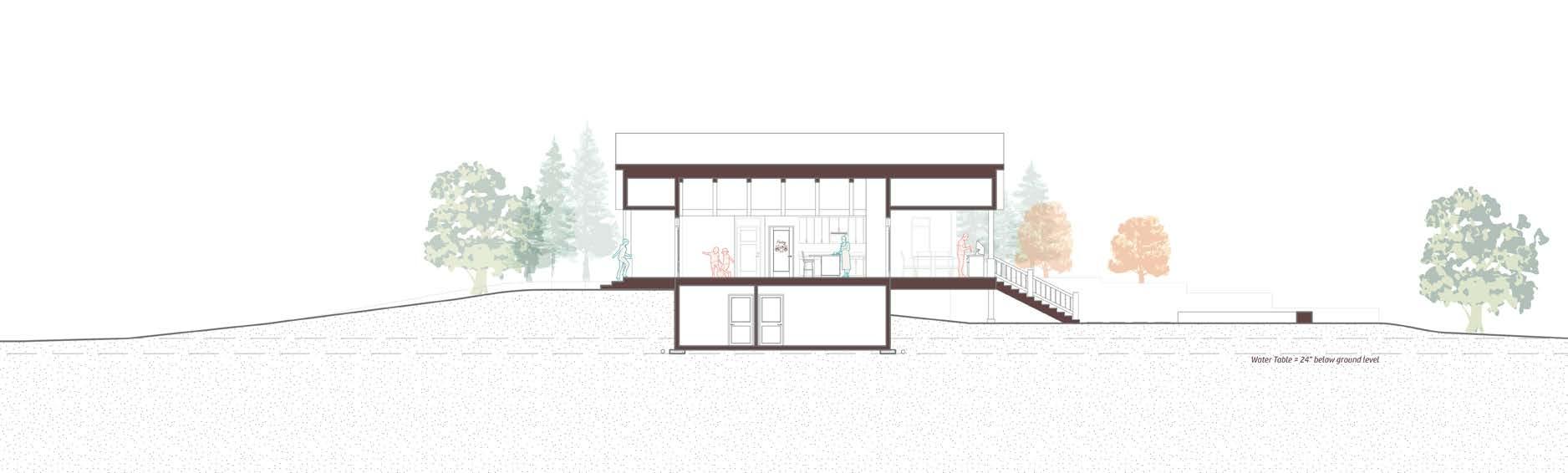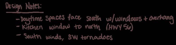 The house design includes a combination of research and functional components. I was able to include my parents as the “client”, which has allowed me to critically design the space based on their functional wants and needs. It is with my parents’ safety in mind that I integrated my research components including the storm shelter core, existing design standards, and site wind barriers. Working through the site and floor plans was a process of connecting spaces and creating a narrative for how those spaces would be used. One particular goal was to create enough space for family gatherings and holidays.