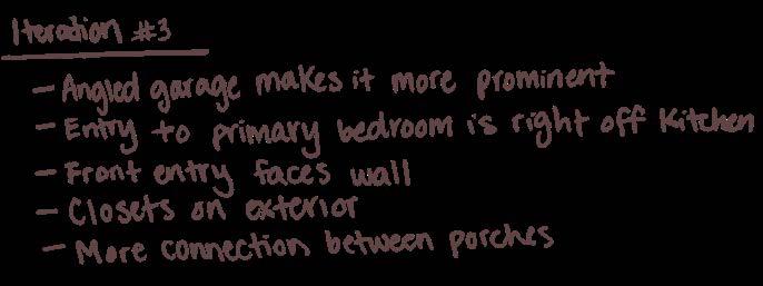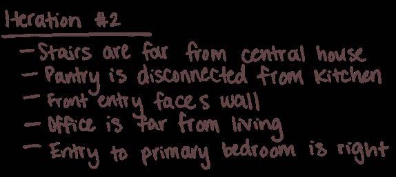 With the program narrative, I was able to begin schematically laying out the spaces and thinking through the connections. Each of my parents have different routines based on their occupation. My mom, who is an accountant wakes up earlier than my dad, who is a farmer, and they both move differently through the house. By mapping out these spaces I was able to see that placing the kitchen and living in the center of the home, while placing the garage, bathroom, laundry, and bedroom together on one side would be the most optimal layout. As I iterated, I was able to incorporate feedback from my parents on each version.