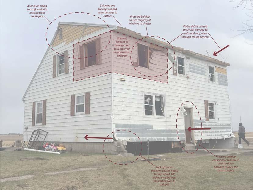 On April 12th, 2022 my parents and hometown experienced an EF-2 tornado. The tornado destroyed nearly every building on the farm that I grew up on in Taopi, Minnesota. Since the event, I have had the growing need to understand why these tornadic winds and severe storms have been increasing their frequency over the past few years. While it can be hard to find the exact reasoning, there are ways in which a dwelling can be designed to be more durable and resilient when these types of events occur. My research includes a combination of sustainable, resilient, and adaptive techniques so that when a dwelling is faced with an event it will be partially salvageable, or in some cases fully salvageable. A partially salvageable dwelling has the ability to be repaired and lived in again. Thus, giving the dwelling the opportunity to live out its full lifespan and allowing for future adaptive changes to occur. The next pages show data that points to the increase in the occurance of climate disasters and the shift of tornado alley.