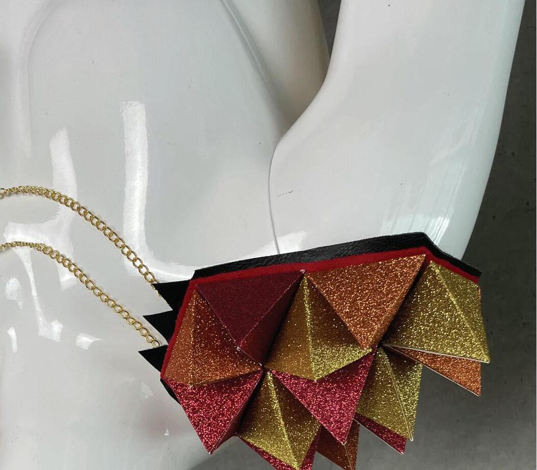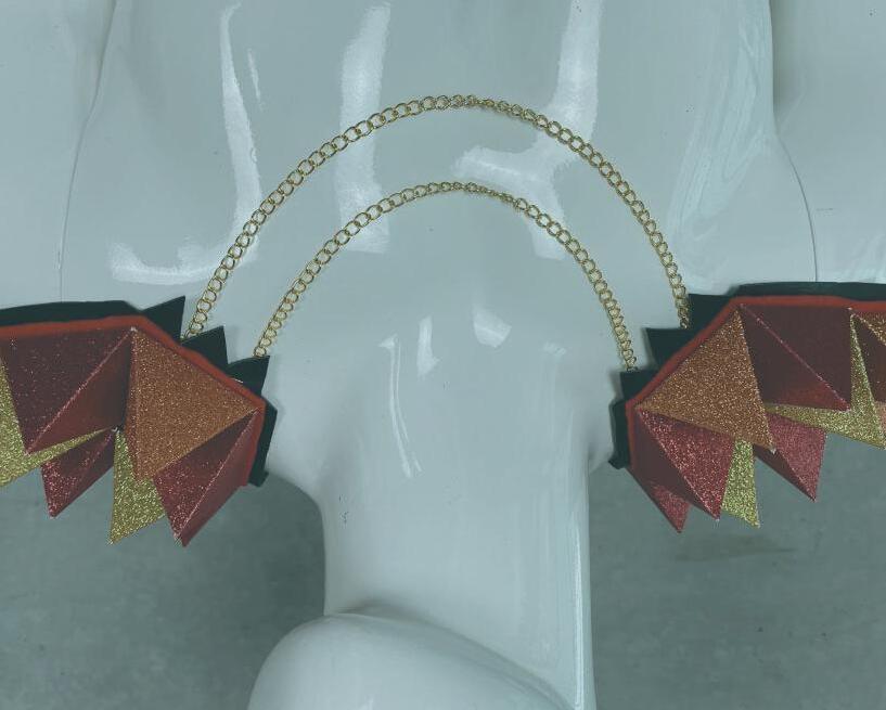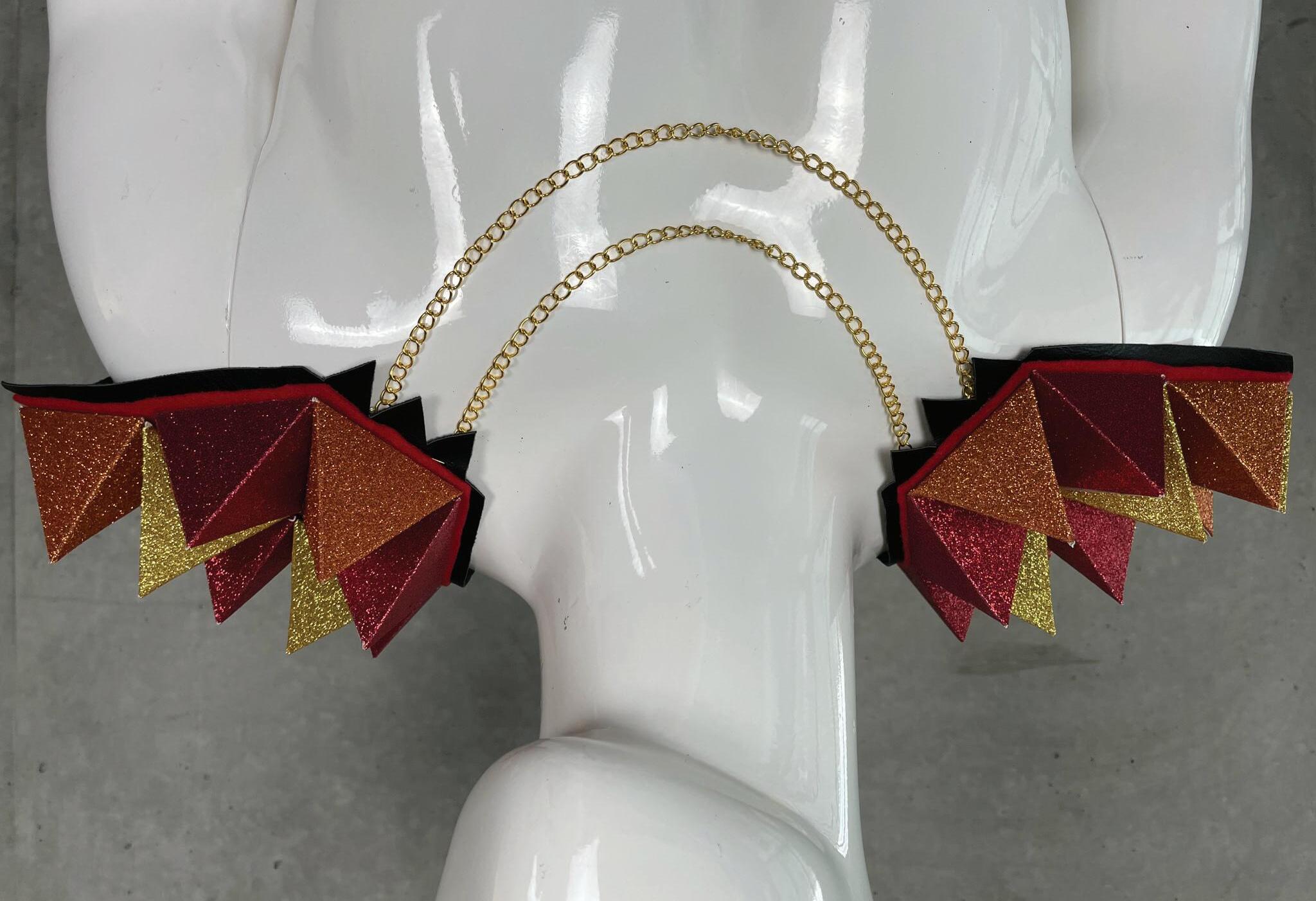 A garment created out of platonic solids. The tetrahedron represents fire elements, which is where the red, yellow, and oranges come from.