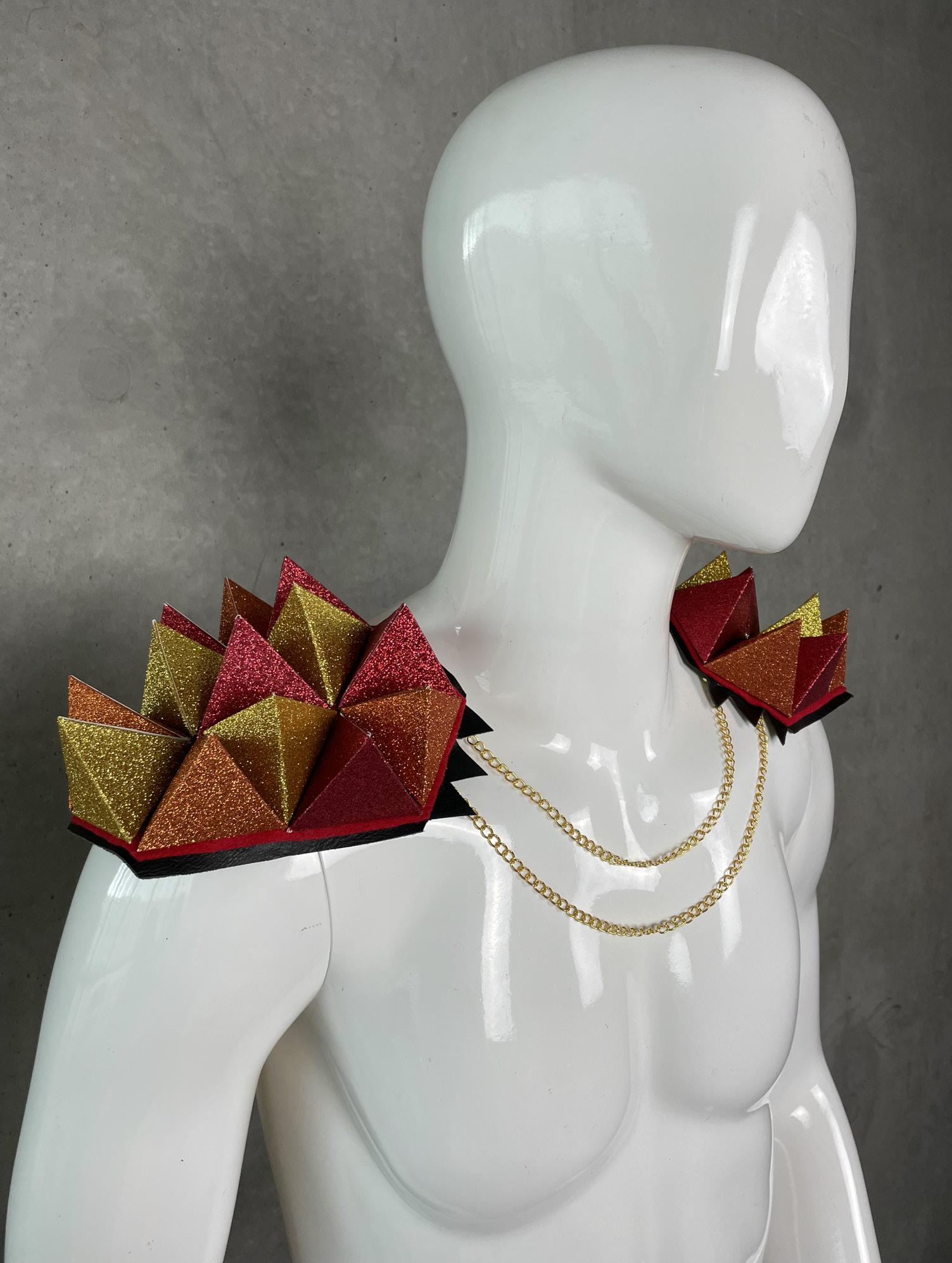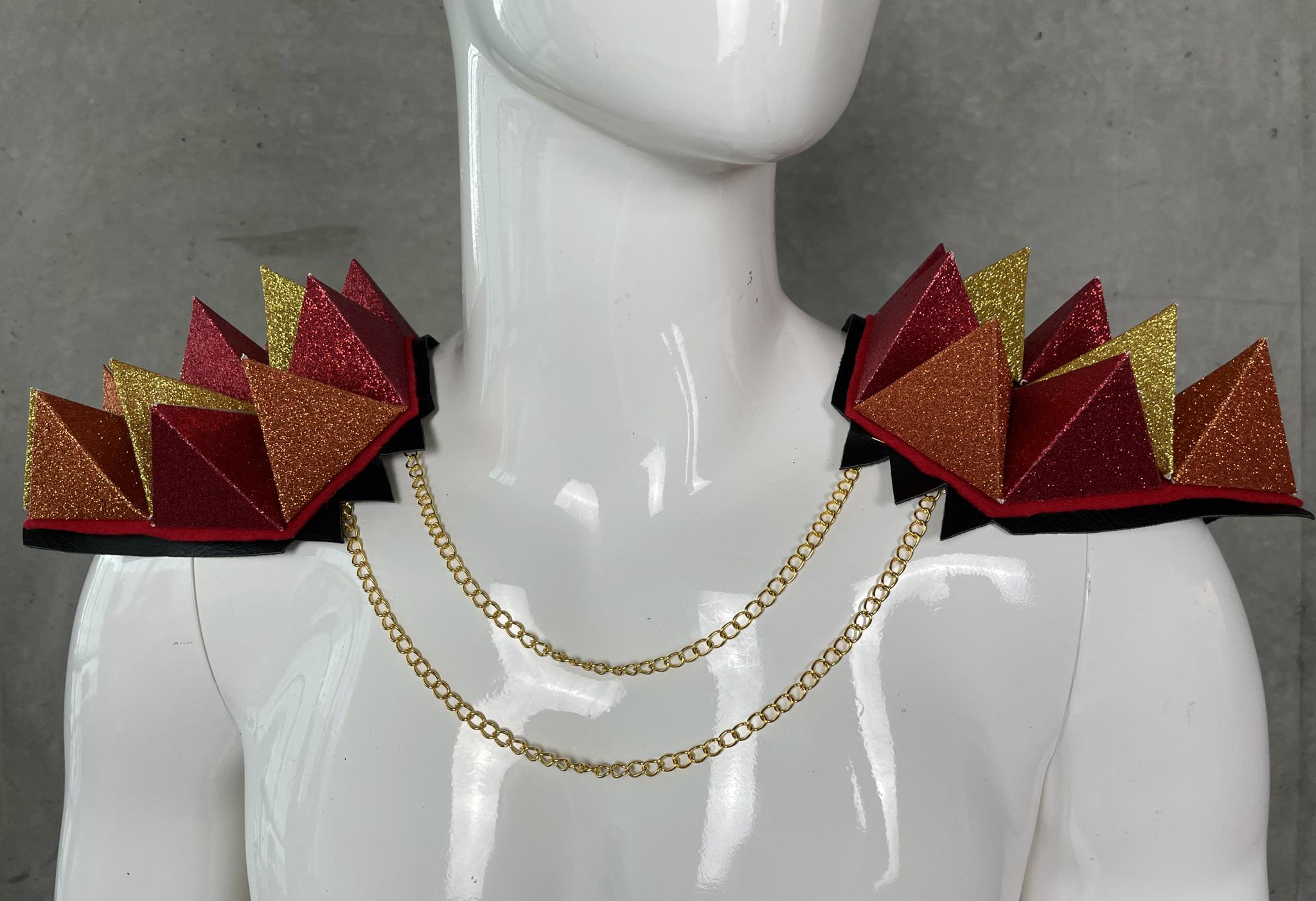A garment created out of platonic solids. The tetrahedron represents fire elements, which is where the red, yellow, and oranges come from.
