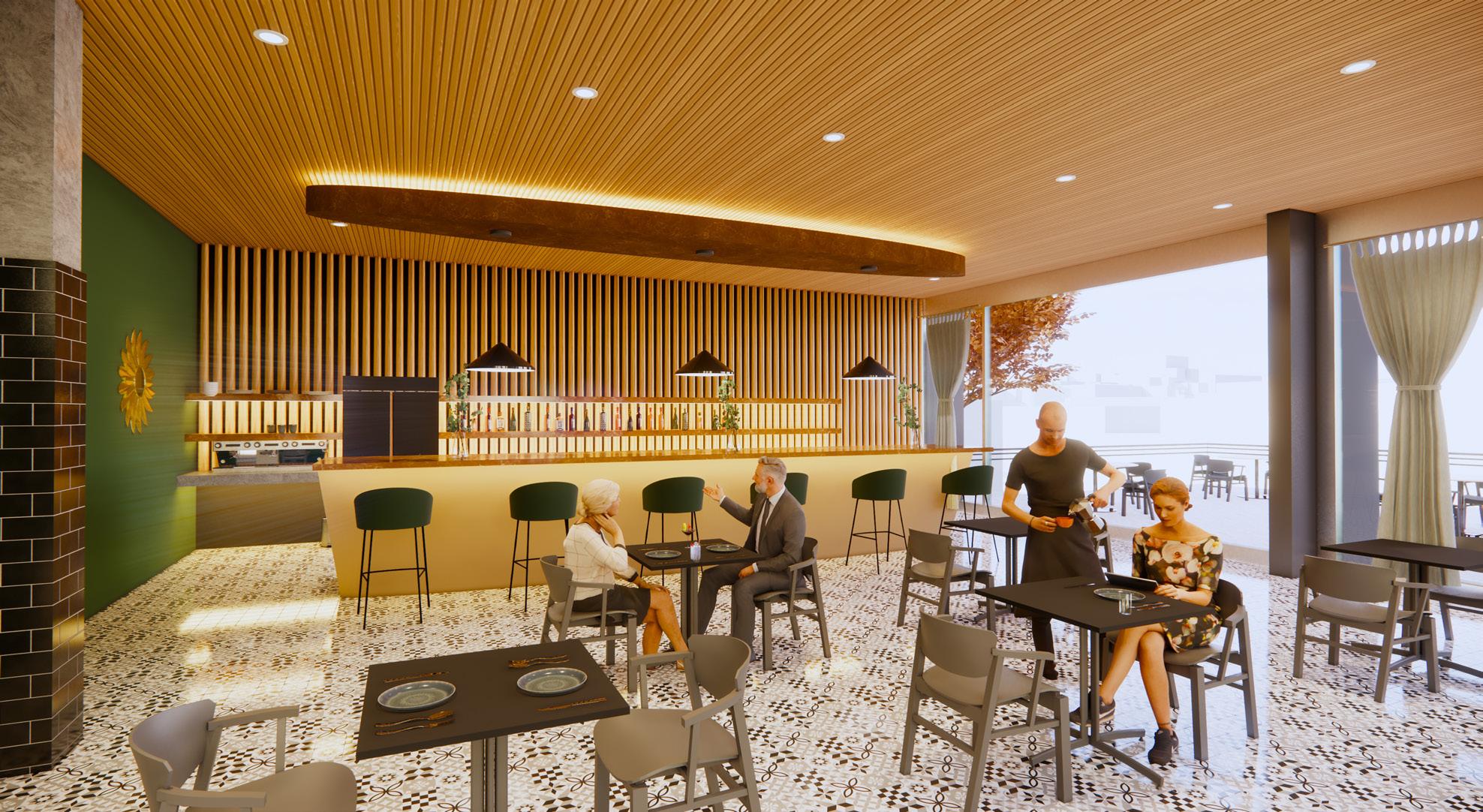 The bar and cafe in the building allows the outside community in, and offers a variety of indoor and outdoor seating for residents and non-residents to interact.
