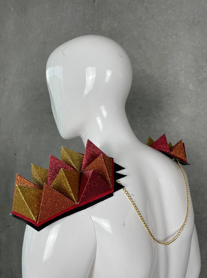 First year platonic solid study creating an aggregate garment out of tetrahedrons that symbolize fire elements.