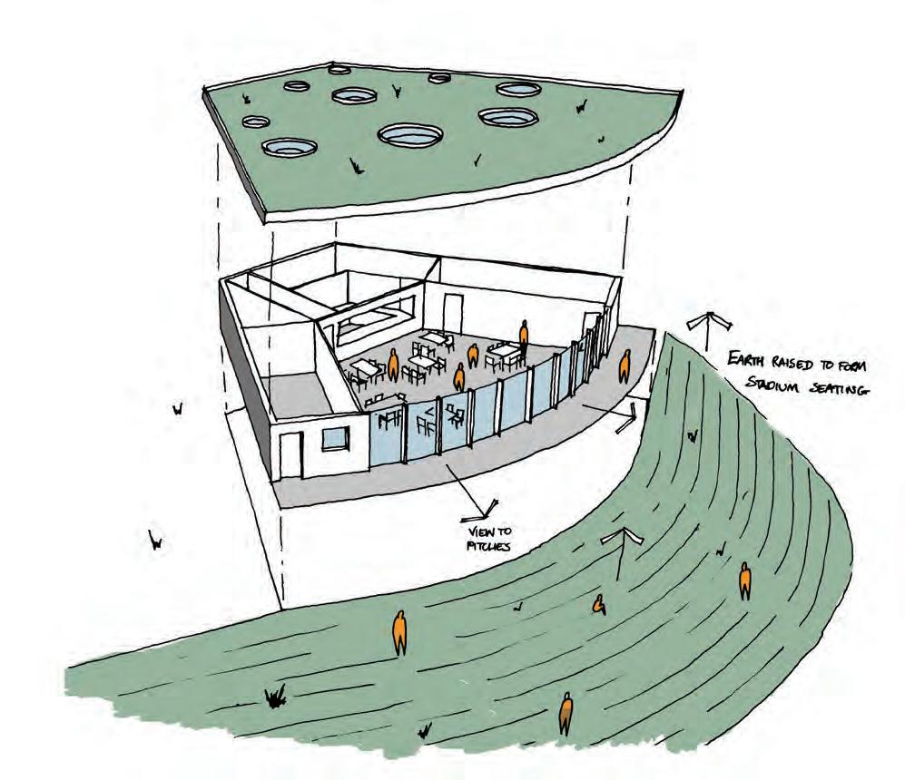 The design deviated from that of a traditional rectangular pavilion. Care was taken in the design to create a centralised hub offering views of both pitches without the need to duplicate aspects of the program. This centralised planning strategy cuts down on the amount of floor space and services needed, helping the project to stay in budget.