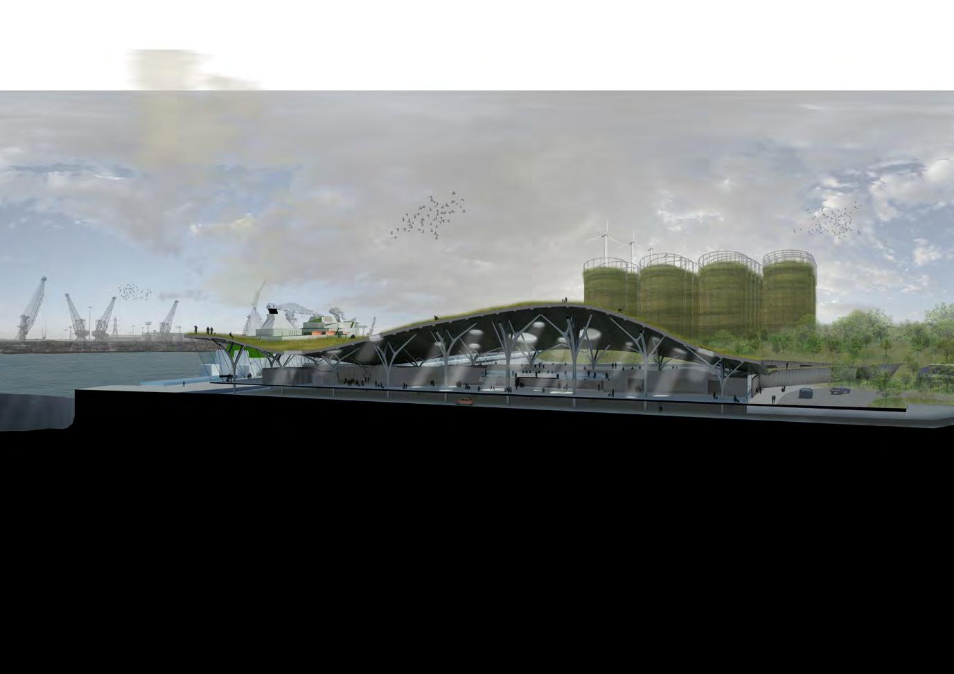 The north Tyneside biodiversity action plan was utilised so that the facility is ‘plugged-into’ and part of the wider narrative of the green corridor running along the edge of the river Tyne, alleviating the sense of non-place found in most travel terminals and creating a new interface with the river which is often unavailable due to the industrial developments along the banks of the Tyne. The green roof offers an area for the local ecology to inhabit, and with the introduction of rare and significant local plant species will create a unique habitat long the banks of the Tyne where endangered and locally significant animal species will benefit from. A strategy for the creation of a green corridor running along the banks of Tyne from the coast to the new wetlands area to the south west of the site was the underpinning concept behind the location of the terminal on the site. The terminal’s boarding area was utilised as a walkway allowing access over the facility for wildlife and visitors.