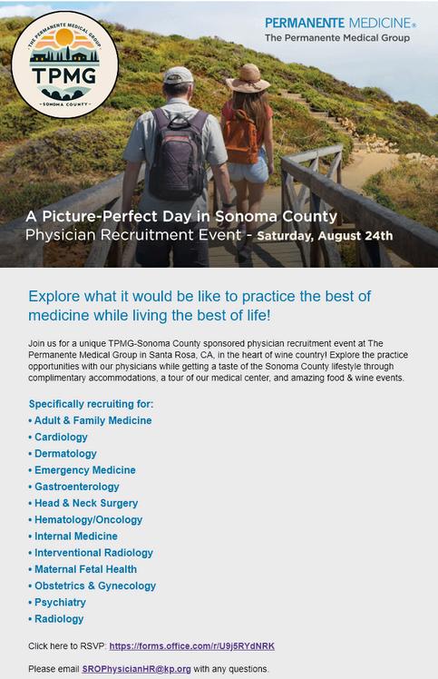 We are happy to share t we are actively planning for our 3rd SRO TPMG Physician Recruitment event on 8/24/24 Please share this invitation widely so we can fill up spots with interested physician candidates.