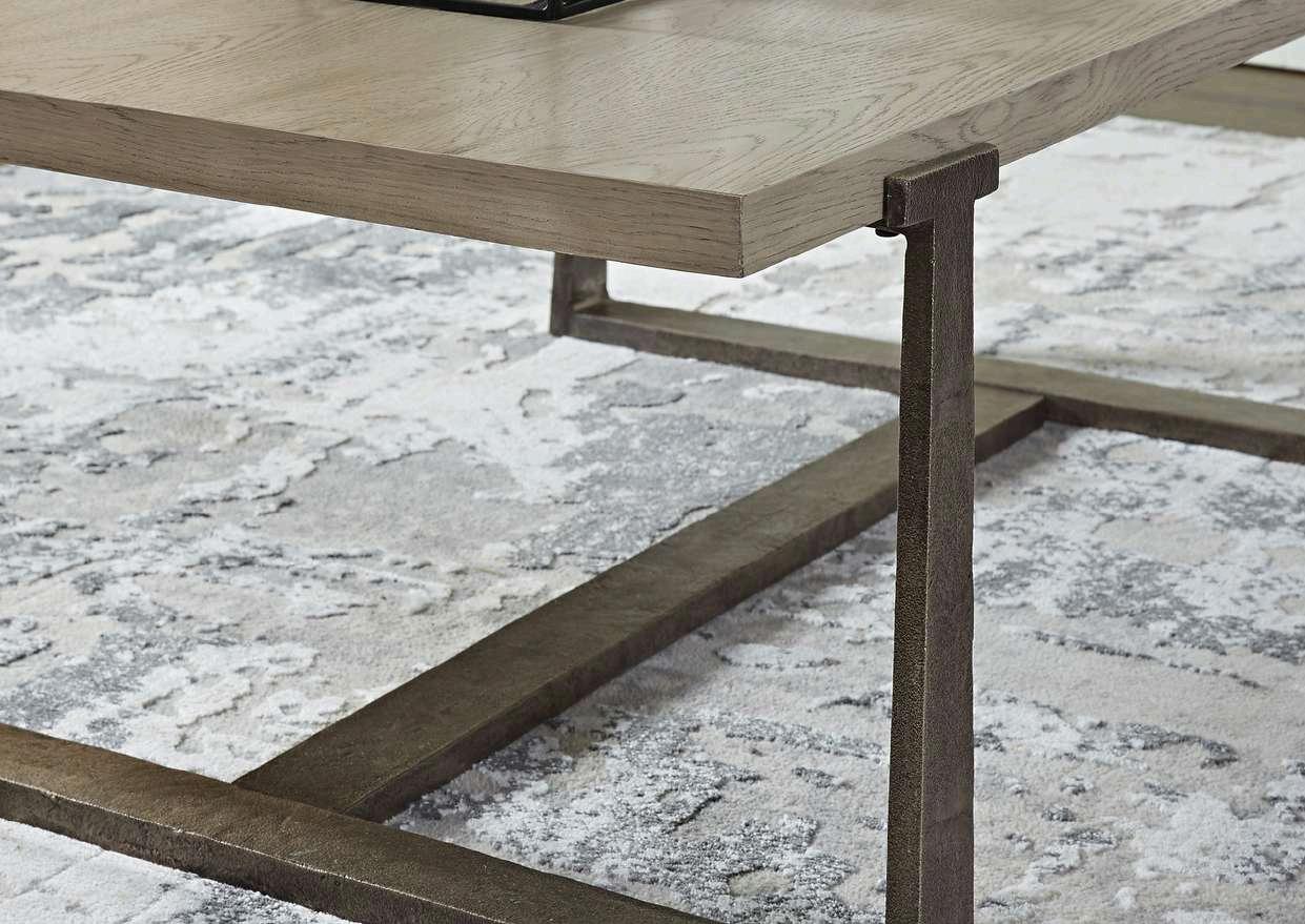 La mesa central Jhonelle con un acabado gris envejecido y patas cuadradas de balaustre colocadas en un amplio estante inferior para una gran presencia. El aspecto está embellecido con chapas de olmo y una mesa enmarcada con efecto tablón