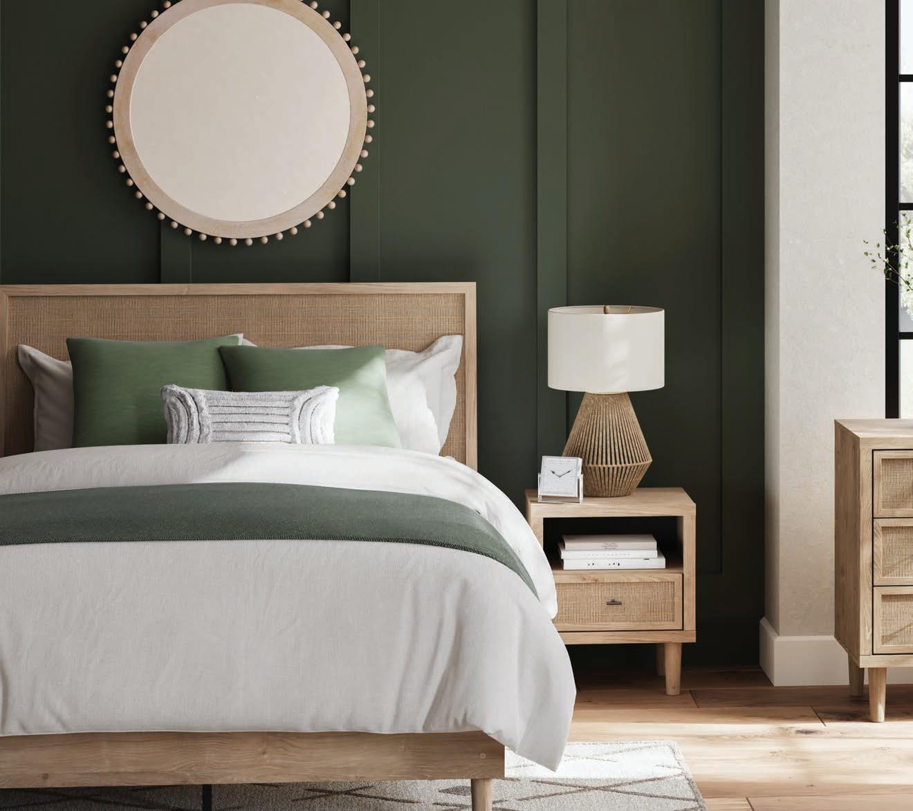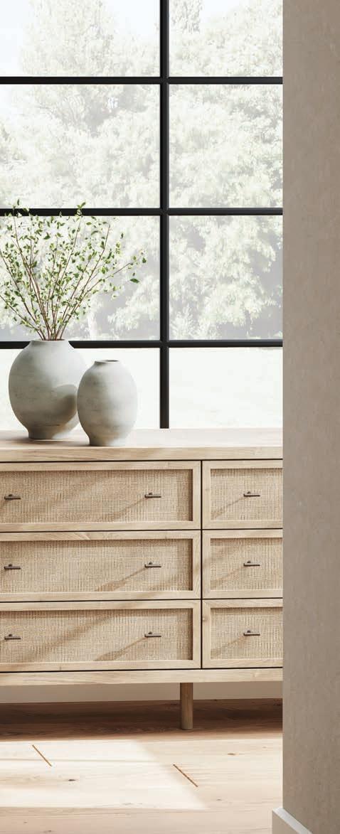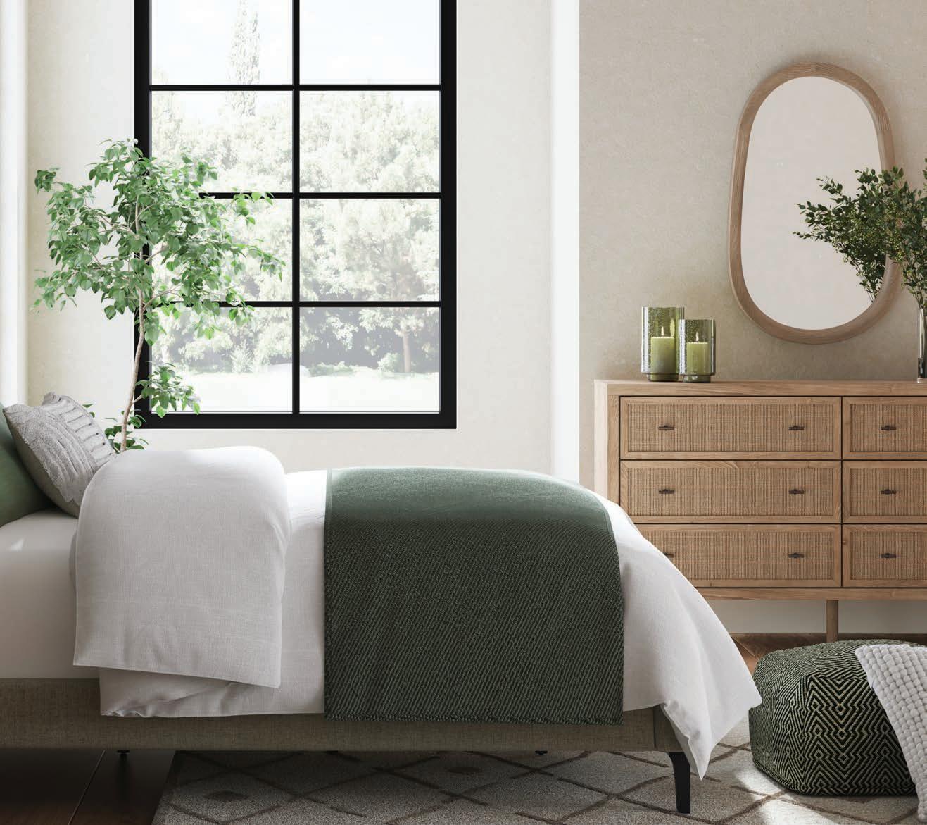 Breathe deeply and find your sanctuary in this modern organic haven. Earthy elements abound, while a platform bed adorned in soft linens serves as the focal point. The dresser and nightstands feature cane accent details, while the woven textures of the bedside lamps add an artisan touch. The living room evokes a laid-back eclectic feel with natural textures and organic shapes, creating a space that feels both calming and refined. When it’s time to entertain, the dining room is set with its farmhouse-inspired table and bench, accented by a rug with intricate patterns and lush greenery. For moments that require focus and flow, the office inspires with its clean lines and natural elements. Here, in this intentional space, peace and reconnection are yours. Namaste.