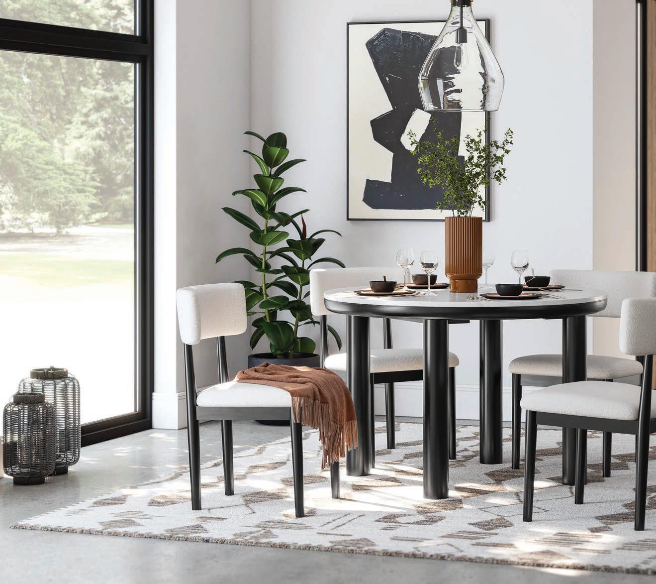 In the art of mixology, the perfect blend of sweet to sour, and salt to sugar creates a harmonious whole. Similarly, impactful design hinges on a blend of contrasting elements. In the bedroom, a curved bouclé headboard adds a touch of sophistication, while slender leg nightstands balances the room. Throw pillows add pops of color and texture, while natural materials like woven rugs and lamp bases ground the space. In the living room, geometric mirrors inject mid-century modernity, an earthy color palette, and organic-shaped tables create an inviting atmosphere. Under the pendant lighting, the dining room becomes the perfect setting for unplugged conversations.