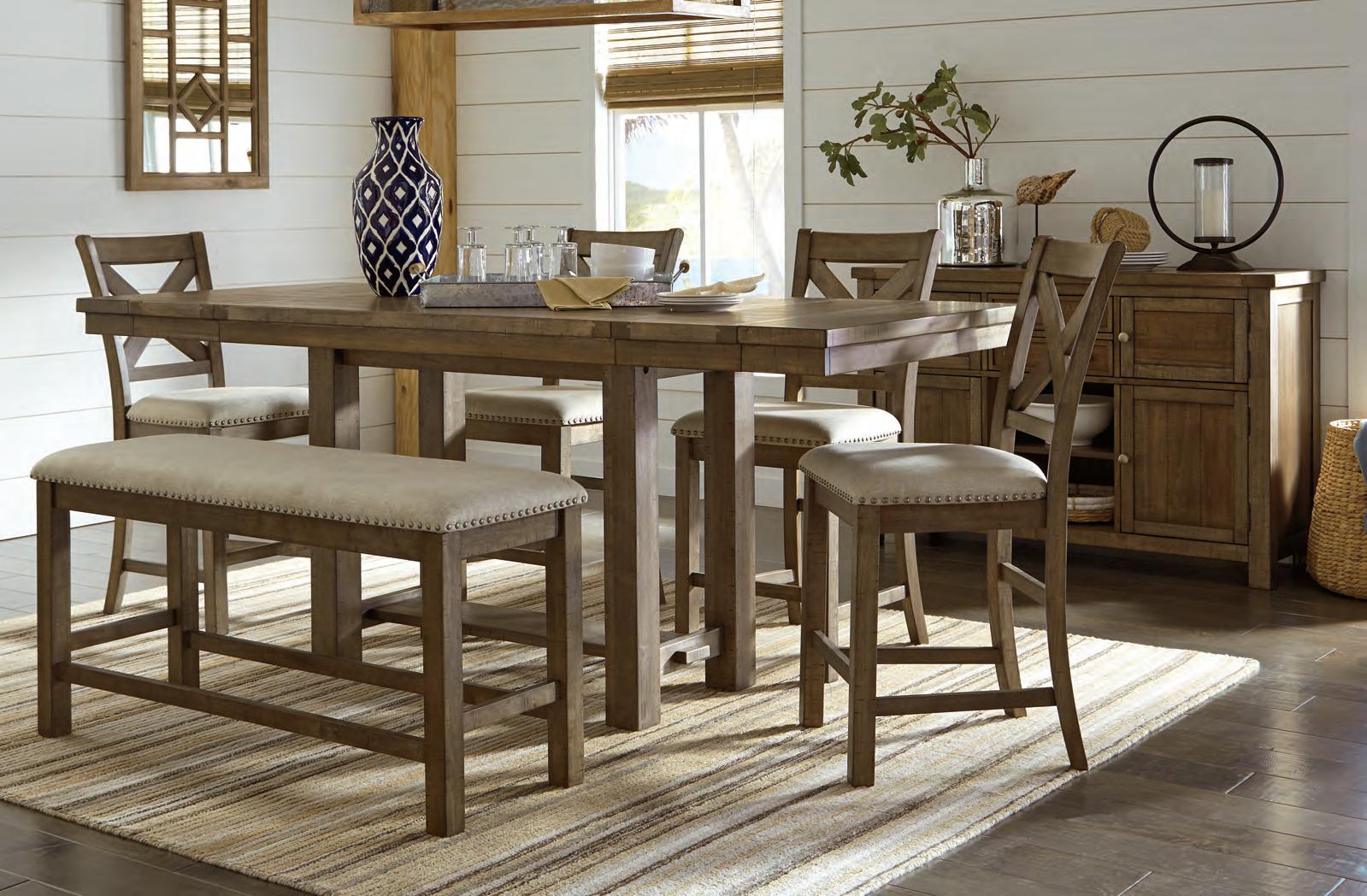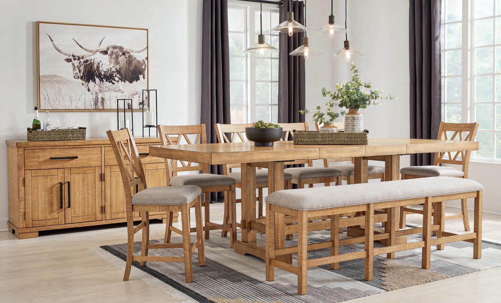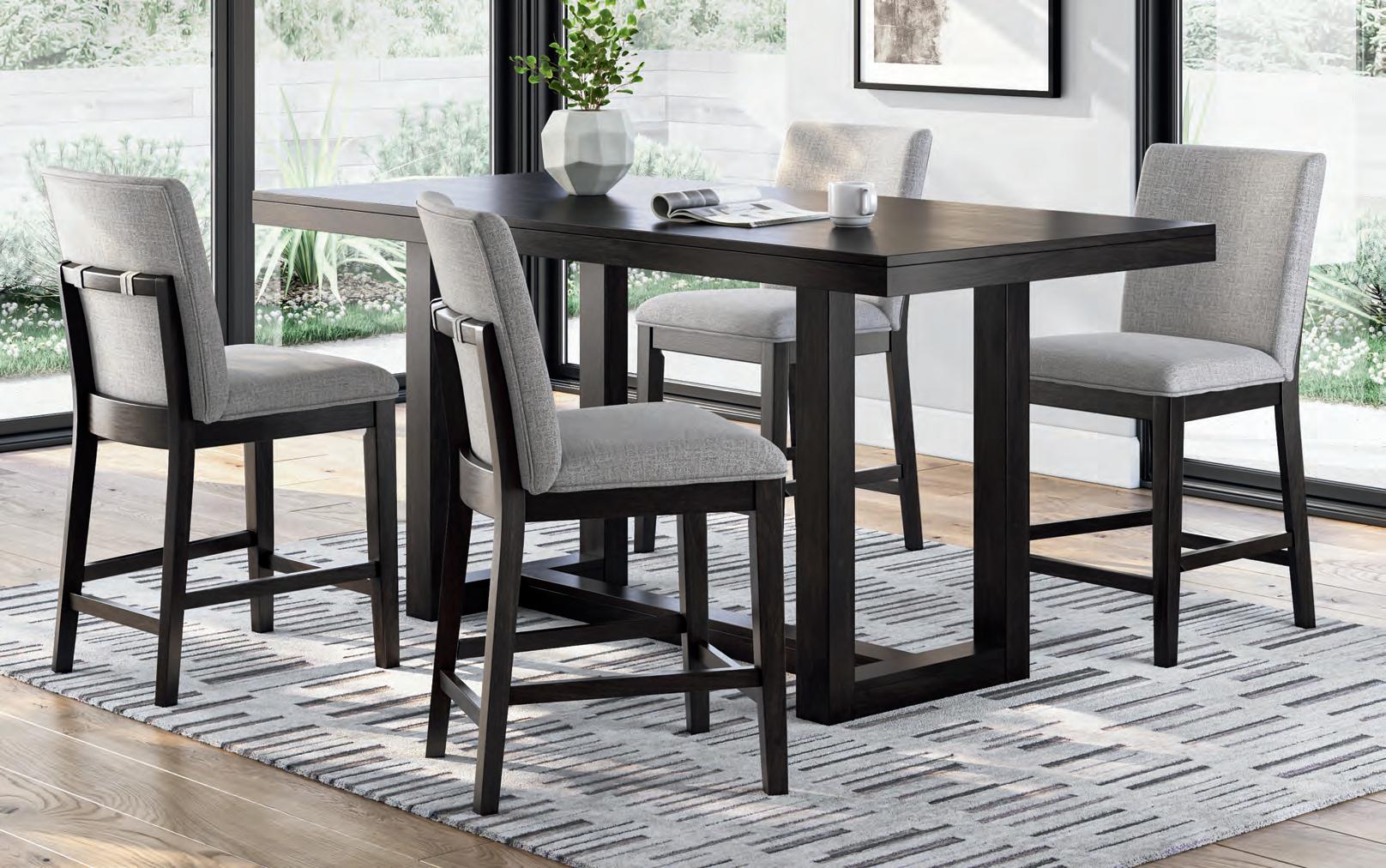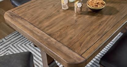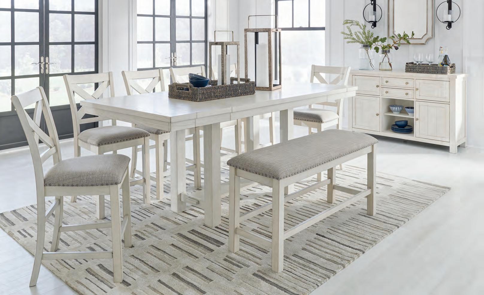 The Rectangular Counter Height Dining Table sits on a stylish Double Trestle base with a thick solid wood framed top that seats up to 6
