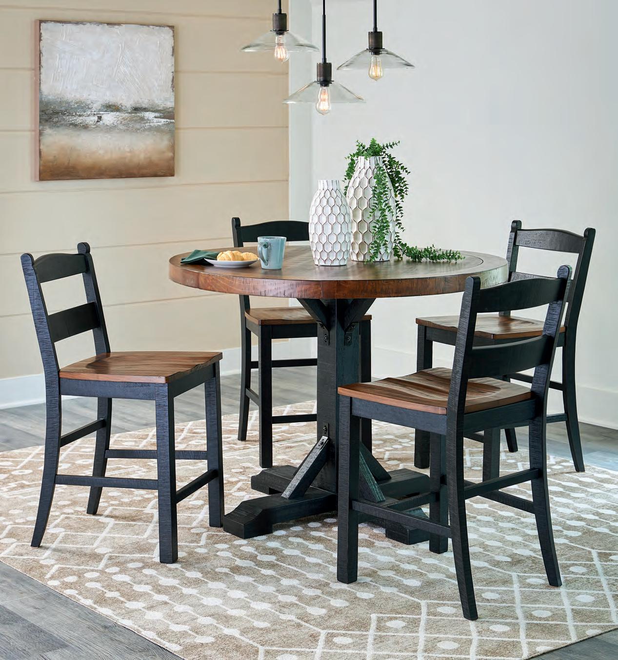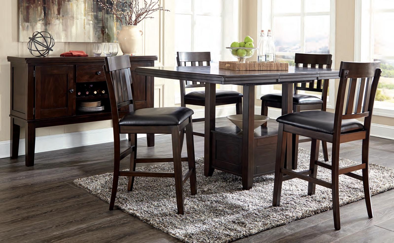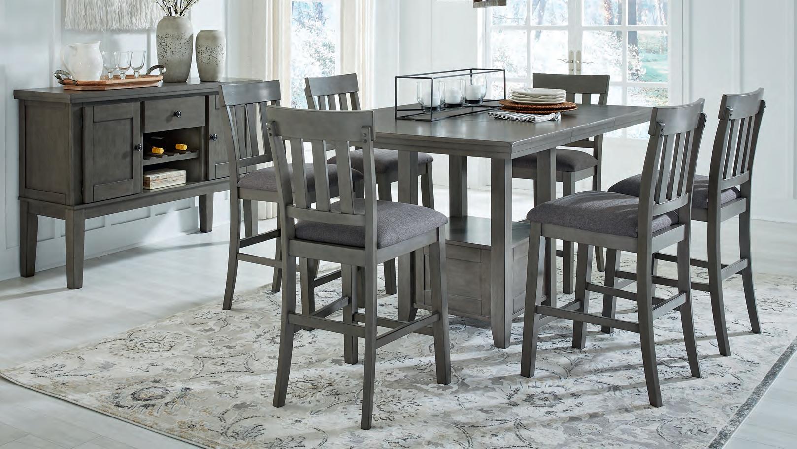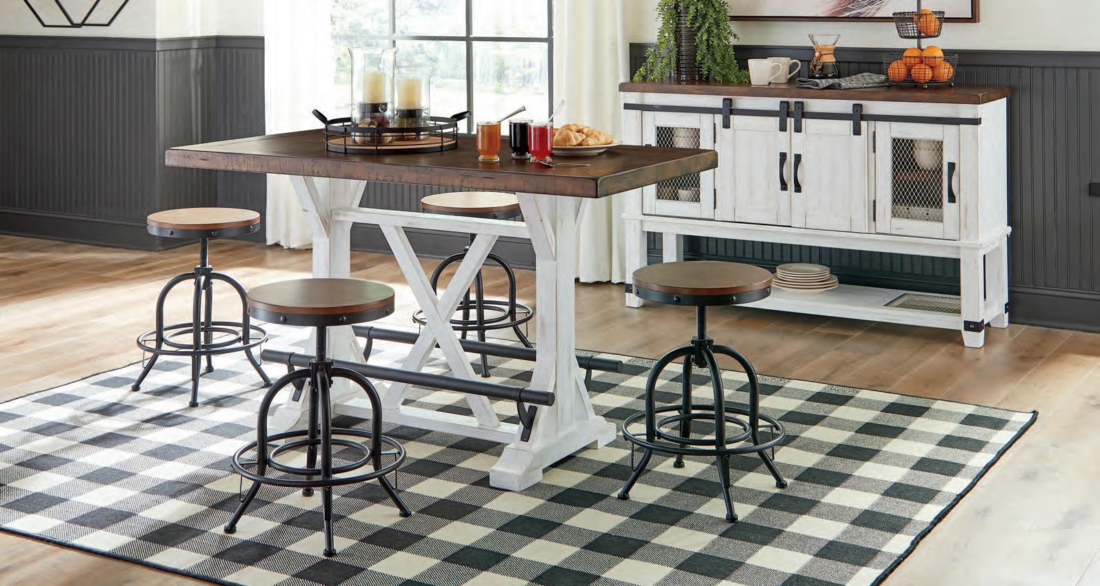 The Rectangular Counter Height Dining Table sits on a stylish Double Trestle base with a thick solid wood framed top that seats up to 6