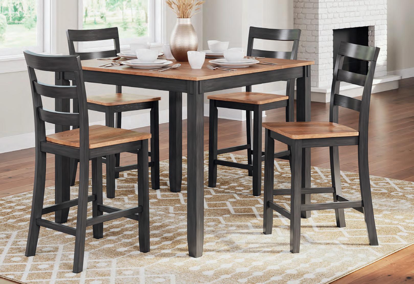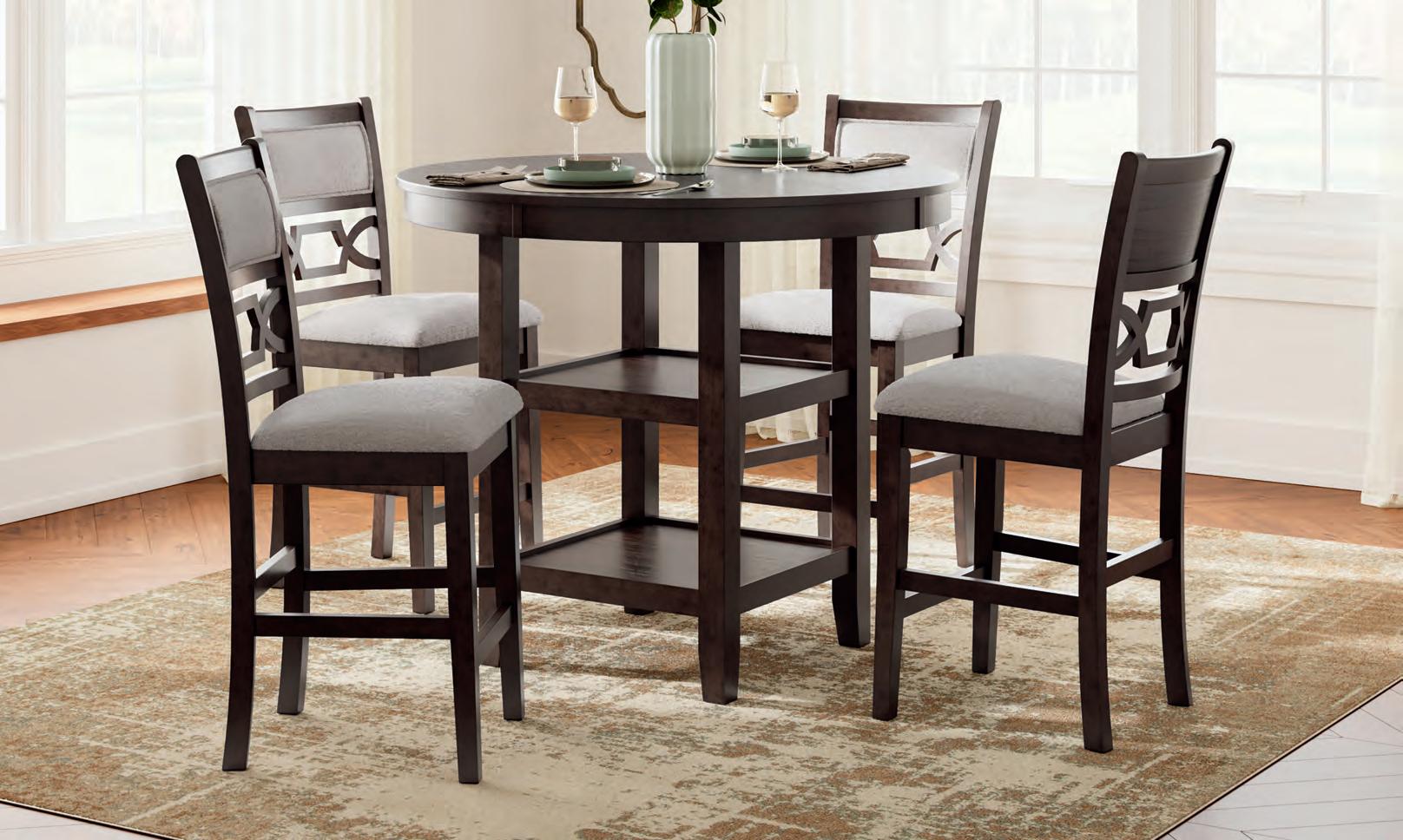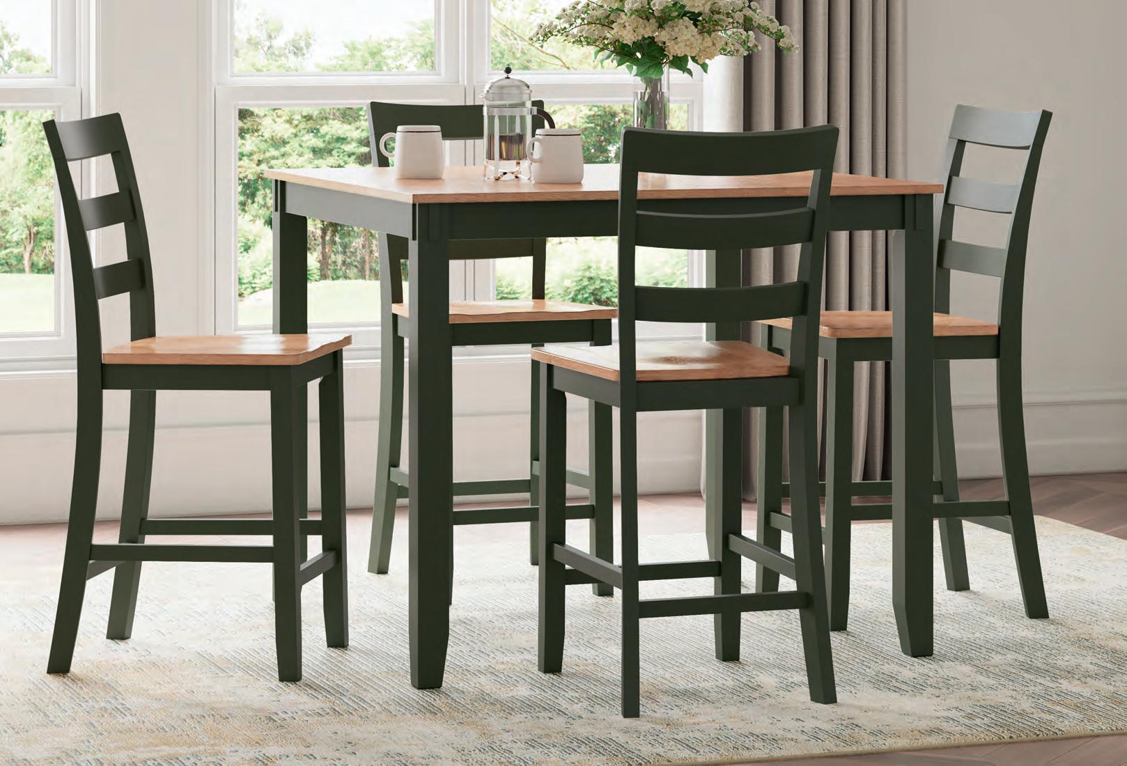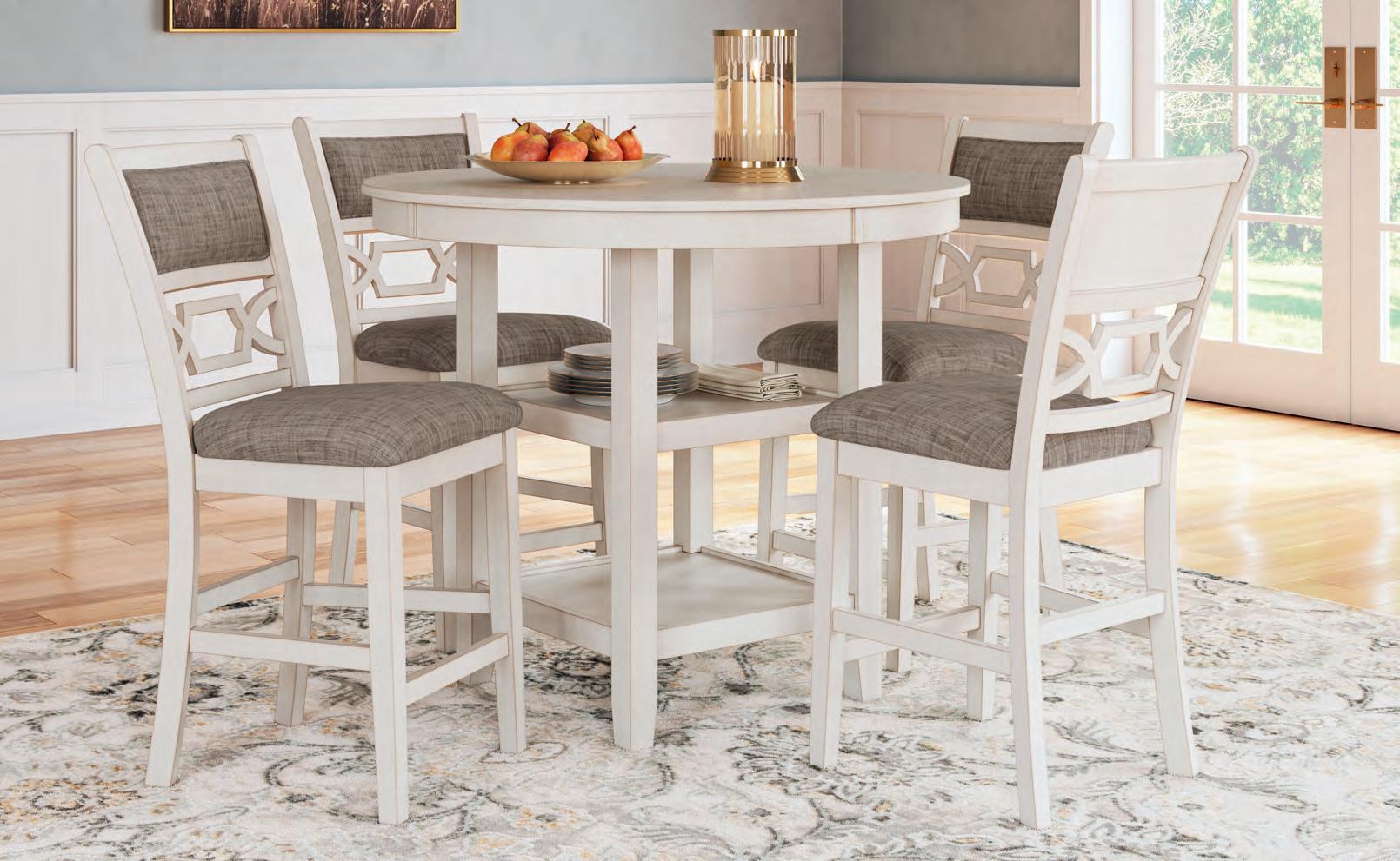 The Rectangular Counter Height Dining Table sits on a stylish Double Trestle base with a thick solid wood framed top that seats up to 6