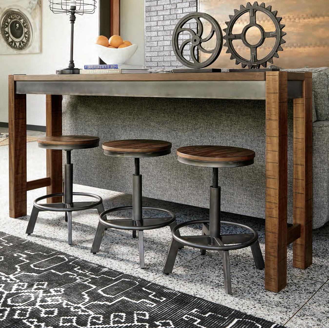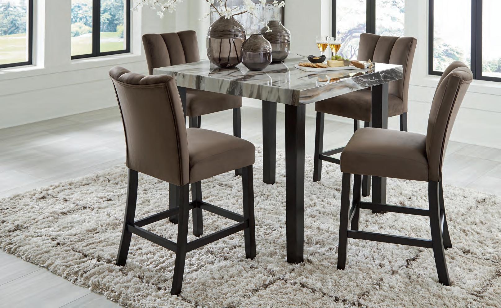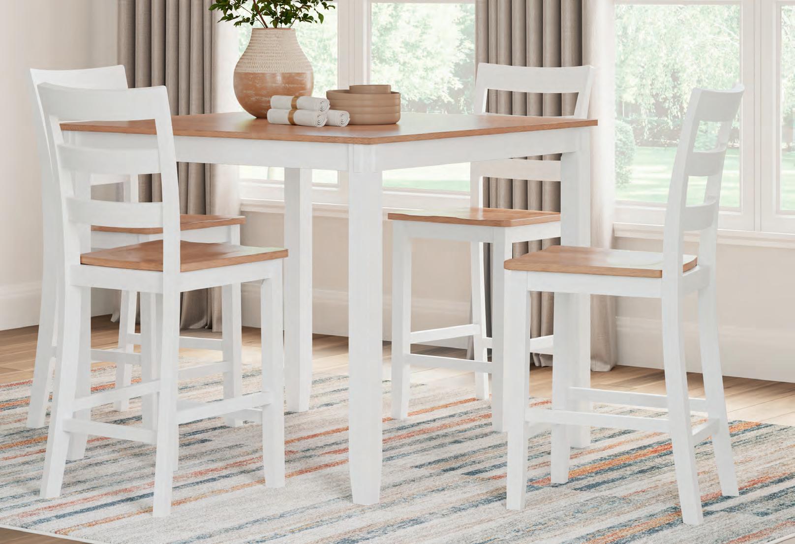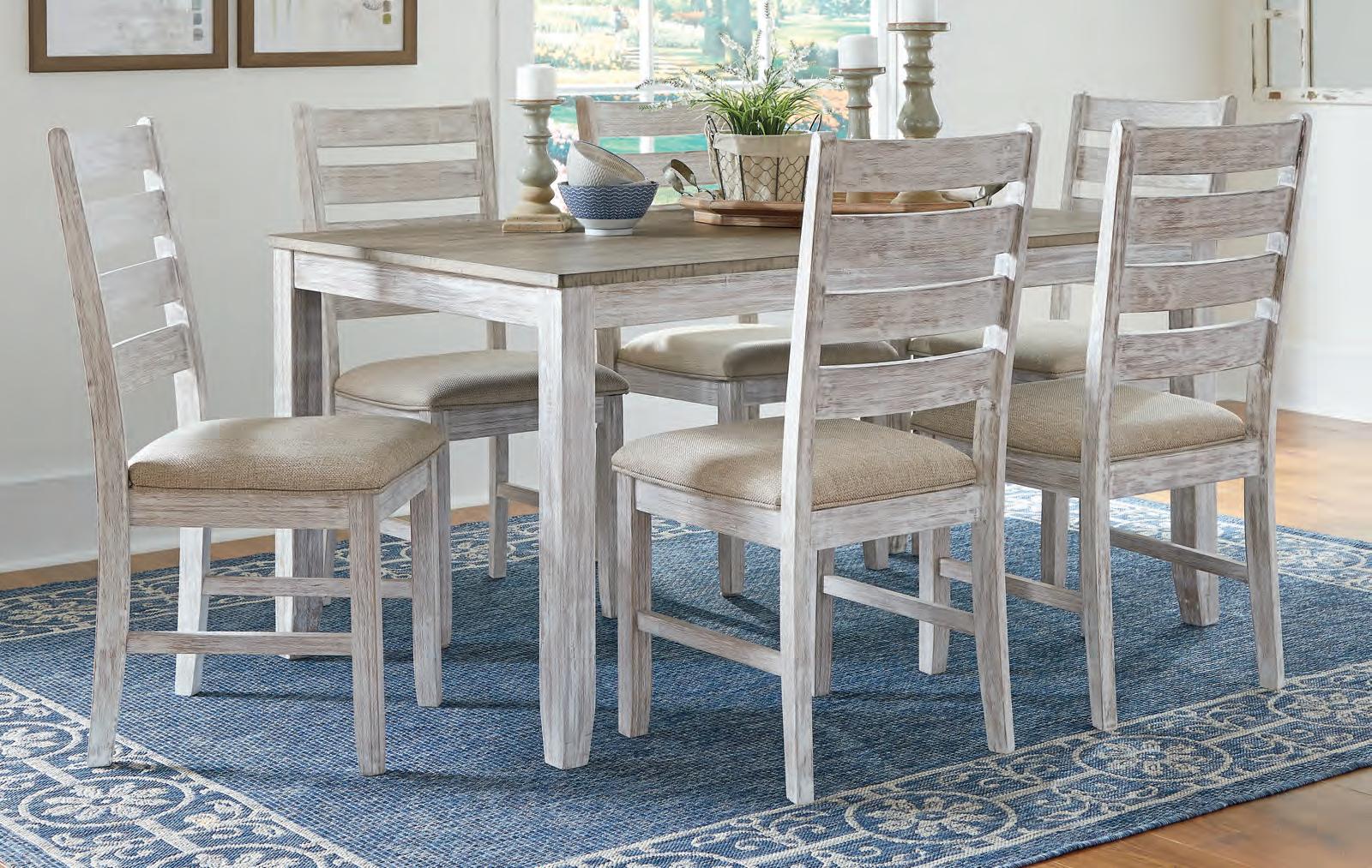 The Rectangular Counter Height Dining Table sits on a stylish Double Trestle base with a thick solid wood framed top that seats up to 6