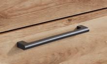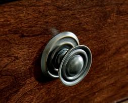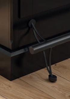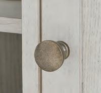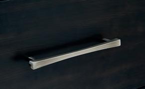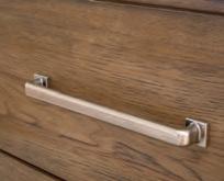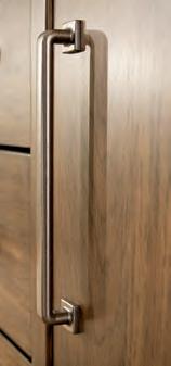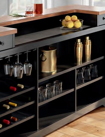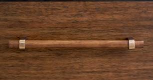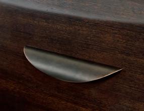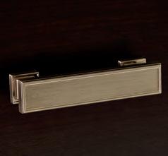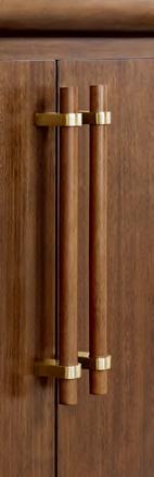 Features custom designed metal bar pulls finished in a rich brass coloration