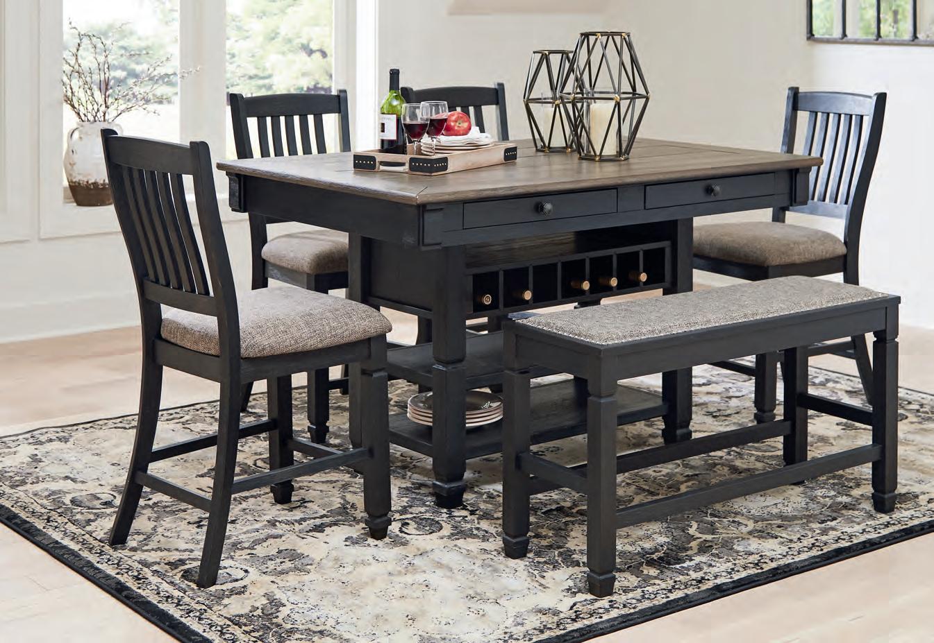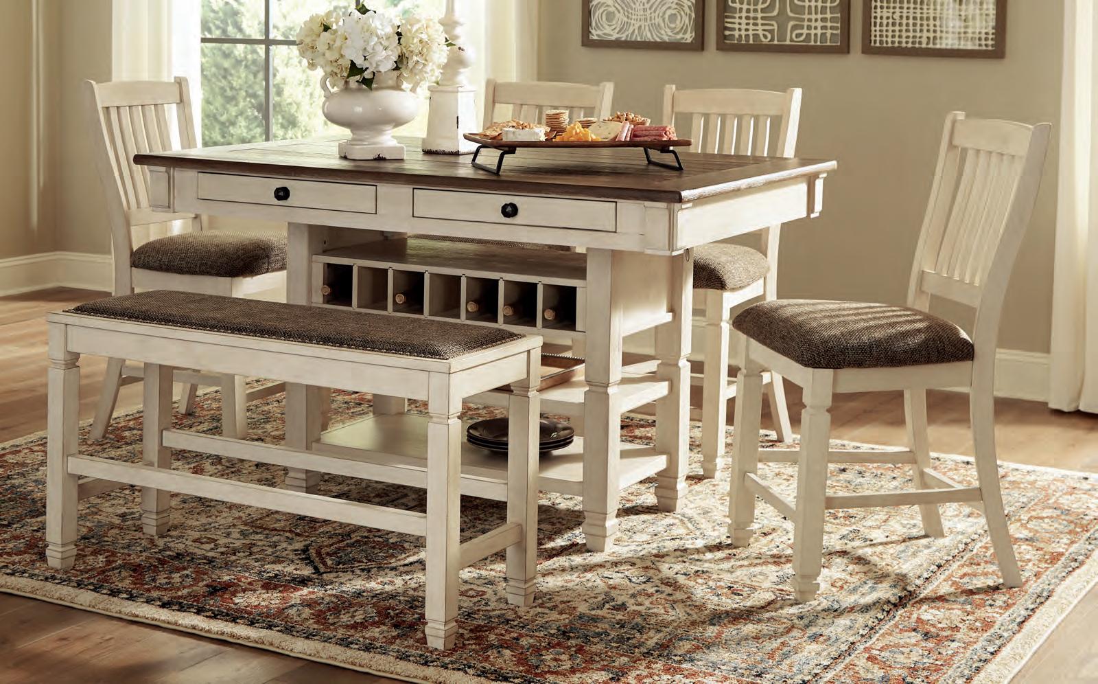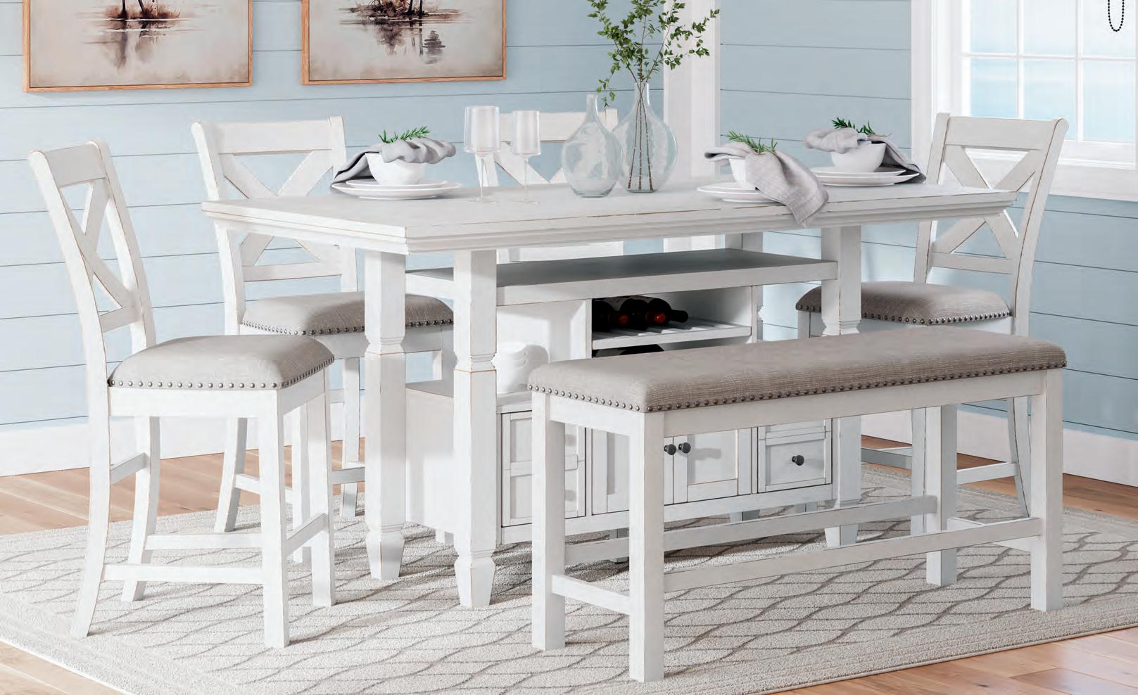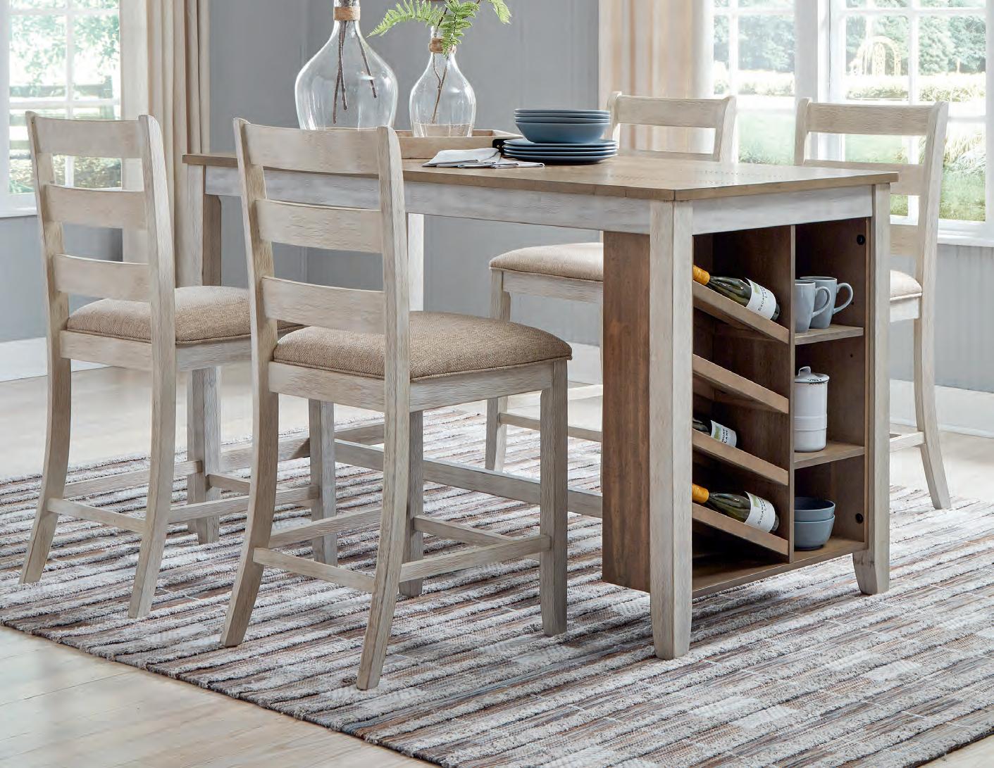 The Rectangular Counter Table features a thick edge table top and stylish double pedestal base along with an integrated wine rack