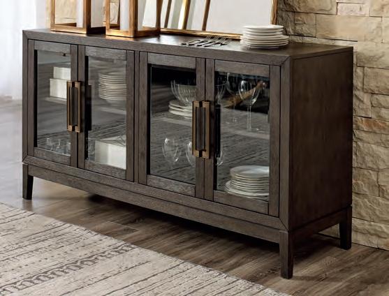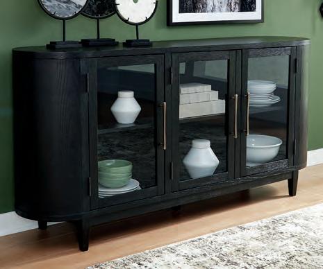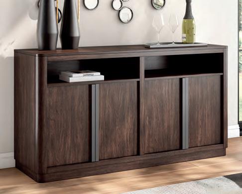 The double door Dining Server features open shelves above and metal rail door pulls in a matte black finish to offer a modern silhouette