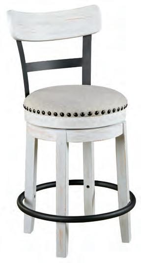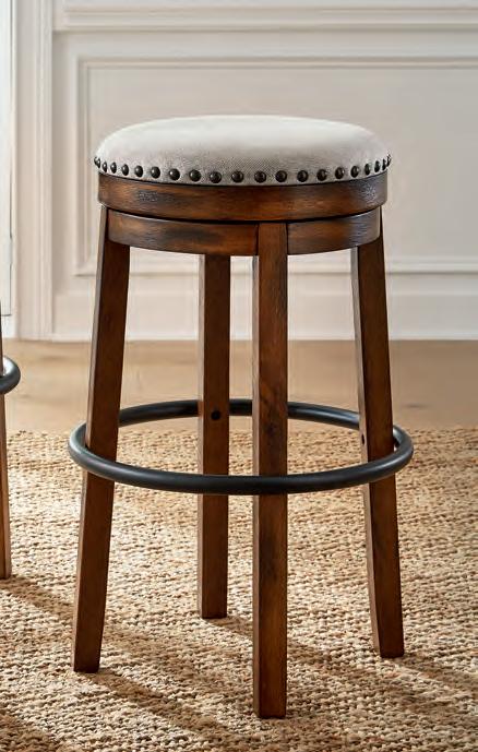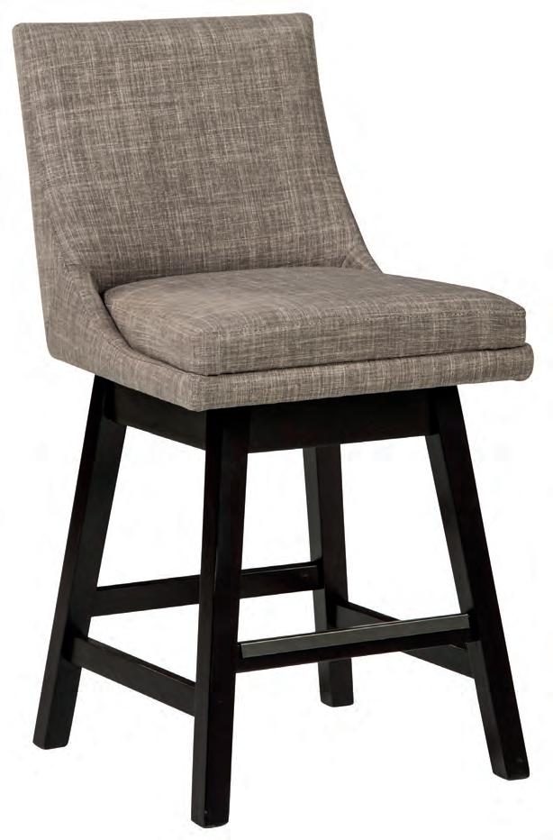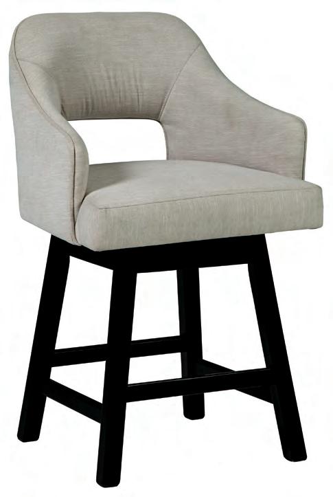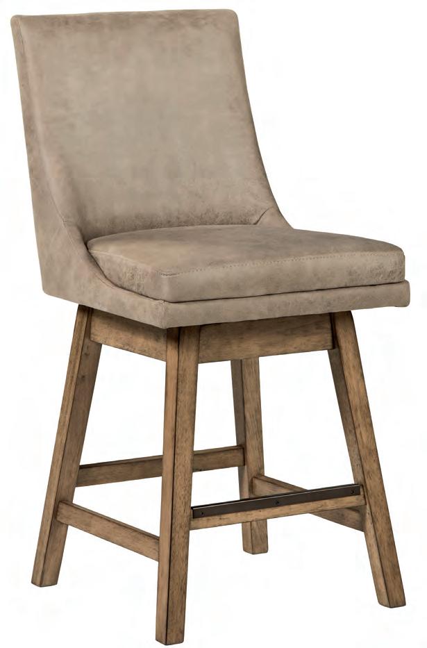 The Upholstered Swivel Barstool features a softly contoured upholstered back design with a beige/brown tweed like fabric along with a metal footrest with a brass colored finish and adjustable levelers