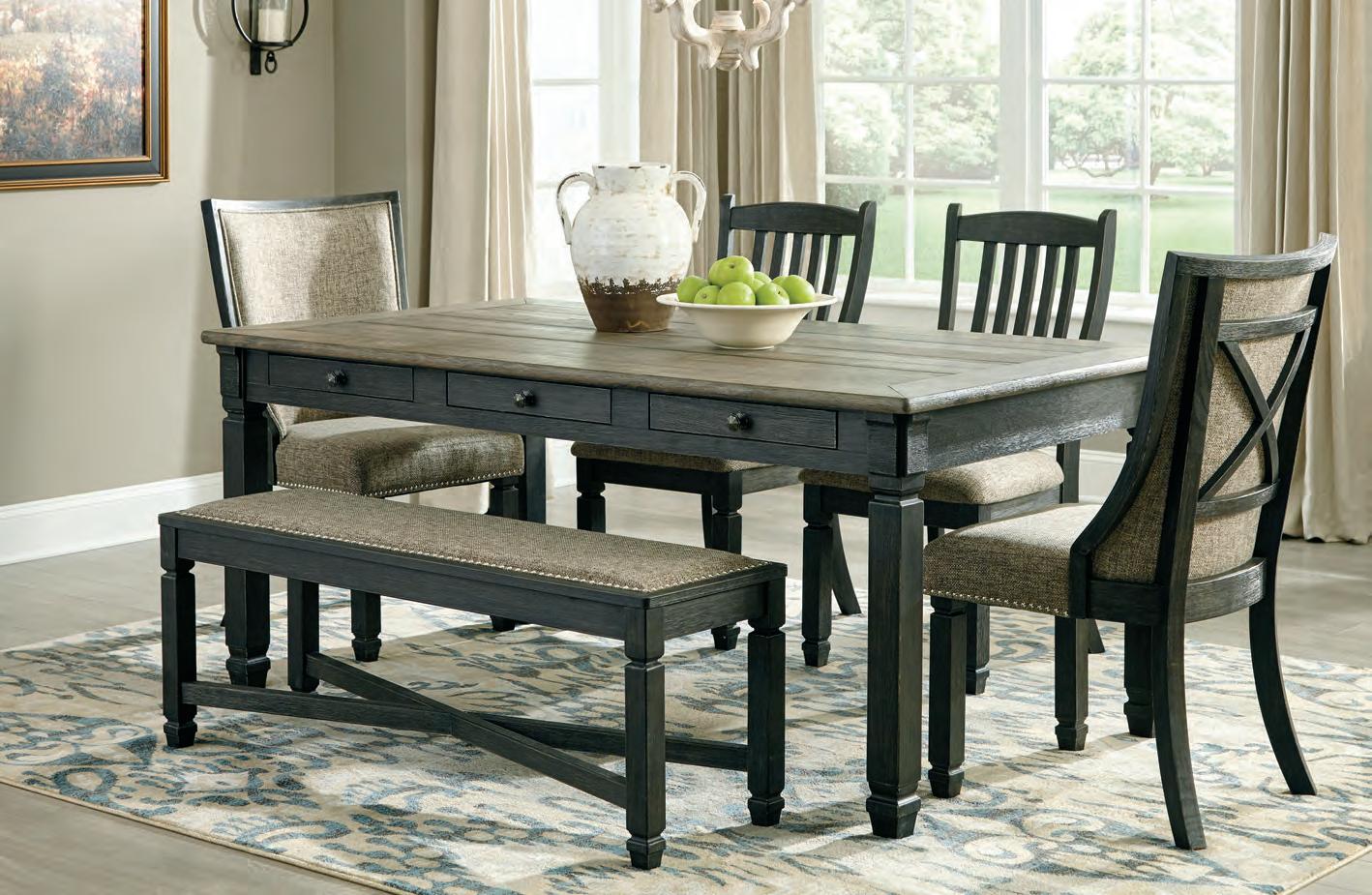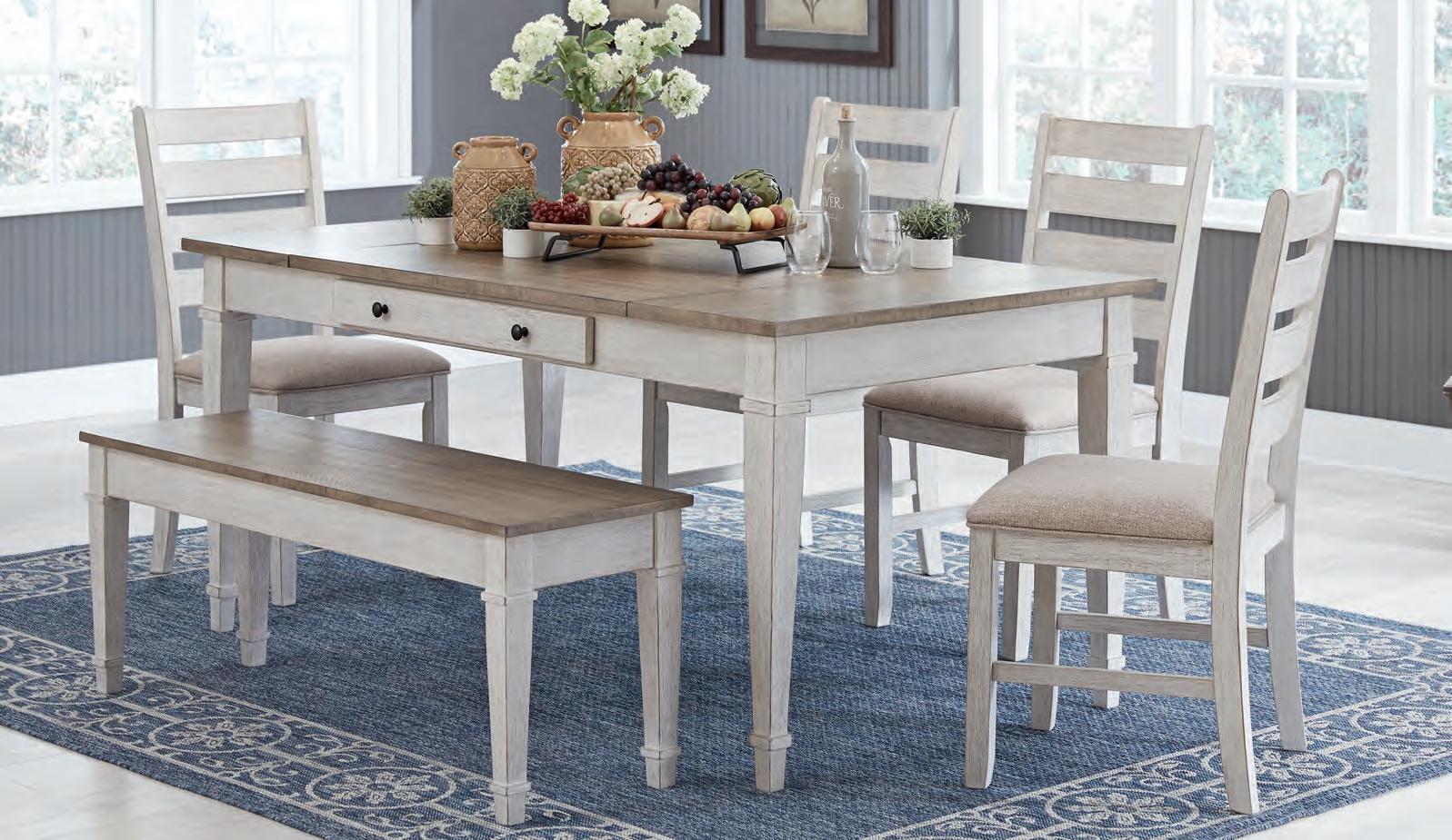 The Dining Bench features ornately shaped legs, a metal accent stretcher and storage drawer with fully finished drawer interior