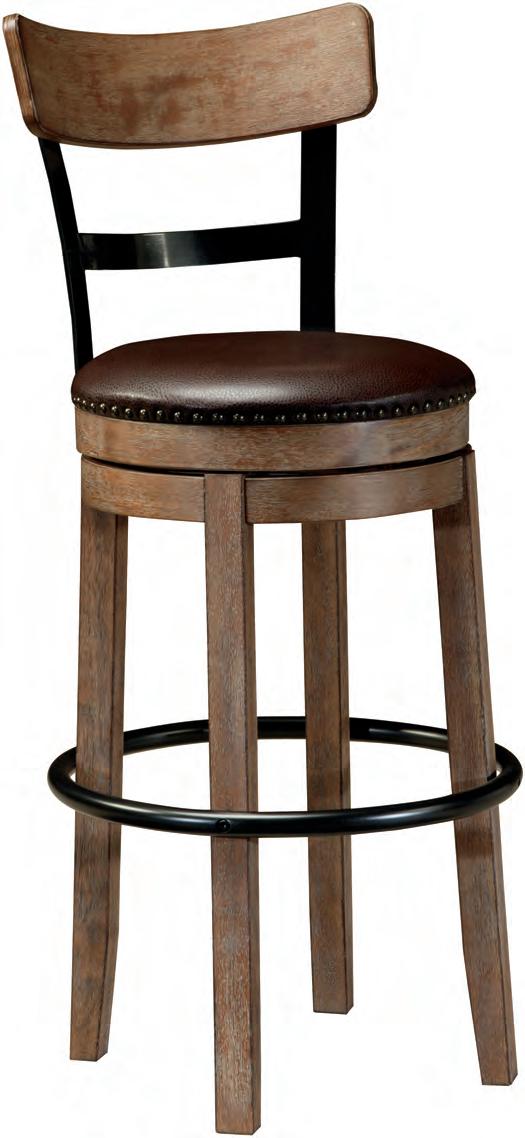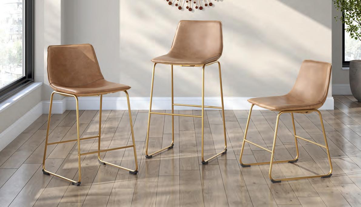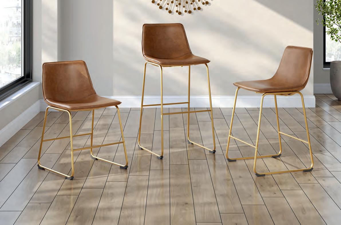 The Upholstered Bar Stools features a casual low-back design with a softly cushioned seat covered with a Brown faux leather upholstery along with a solid wood frame with light brown glazed finish