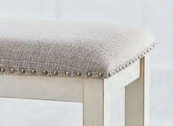 The Dining Bench features ornately shaped legs, a metal accent stretcher and storage drawer with fully finished drawer interior